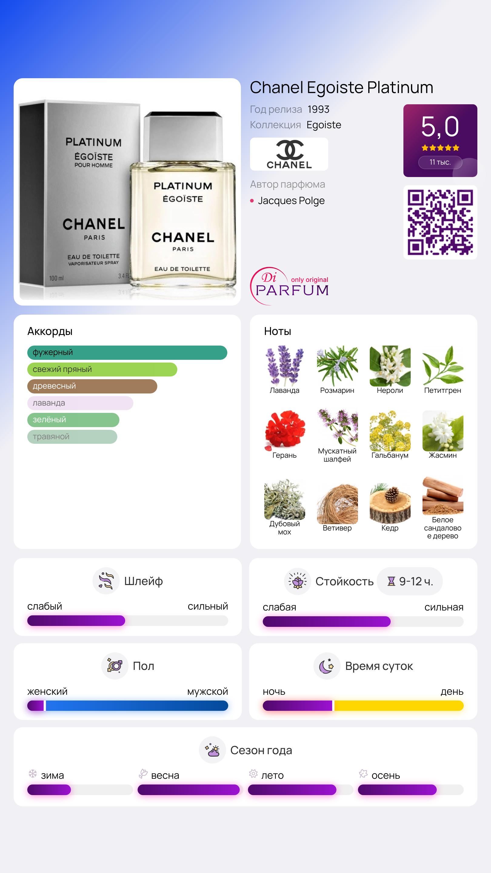 В сердце композиции Egoiste Platinum звучат мужественный кавказский шалфей и элегантная бурбонская герань. Завершает ароматная картина древесный мох, ветивер, кедр и ладан, которые придают парфюму глубокую и чувственную основу.