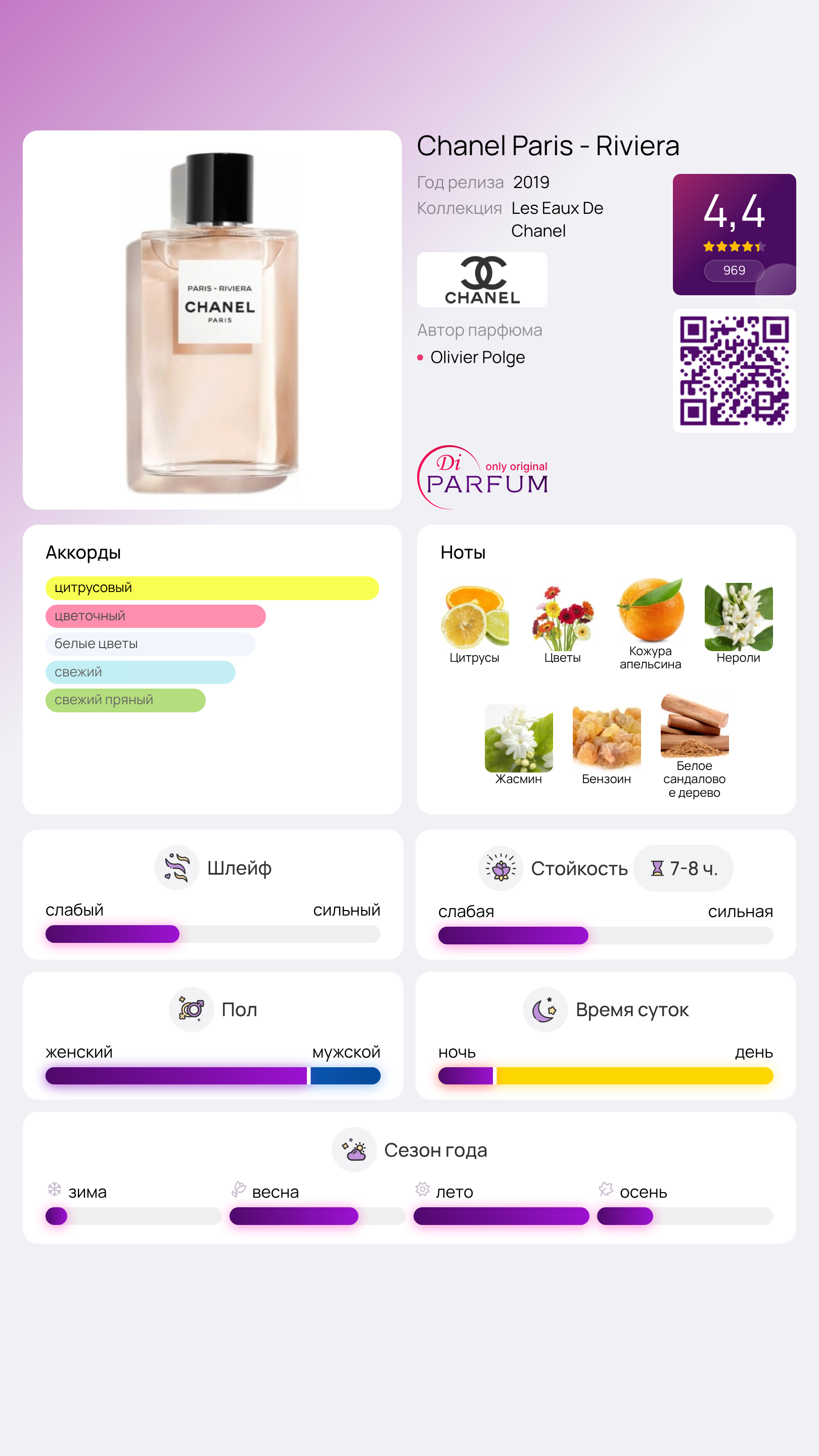 Поражая европейскую публику, Chanel Paris – Riviera продолжает своё триумфальное путешествие по всему миру, открывая новые, яркие грани бренда Шанель. Эти духи идеально вписываются в концепцию унисекса, не указывая на доминирование какого-либо из полов, а их умеренная стойкость и насыщенность не затмевают ароматы цветущей природы вокруг.