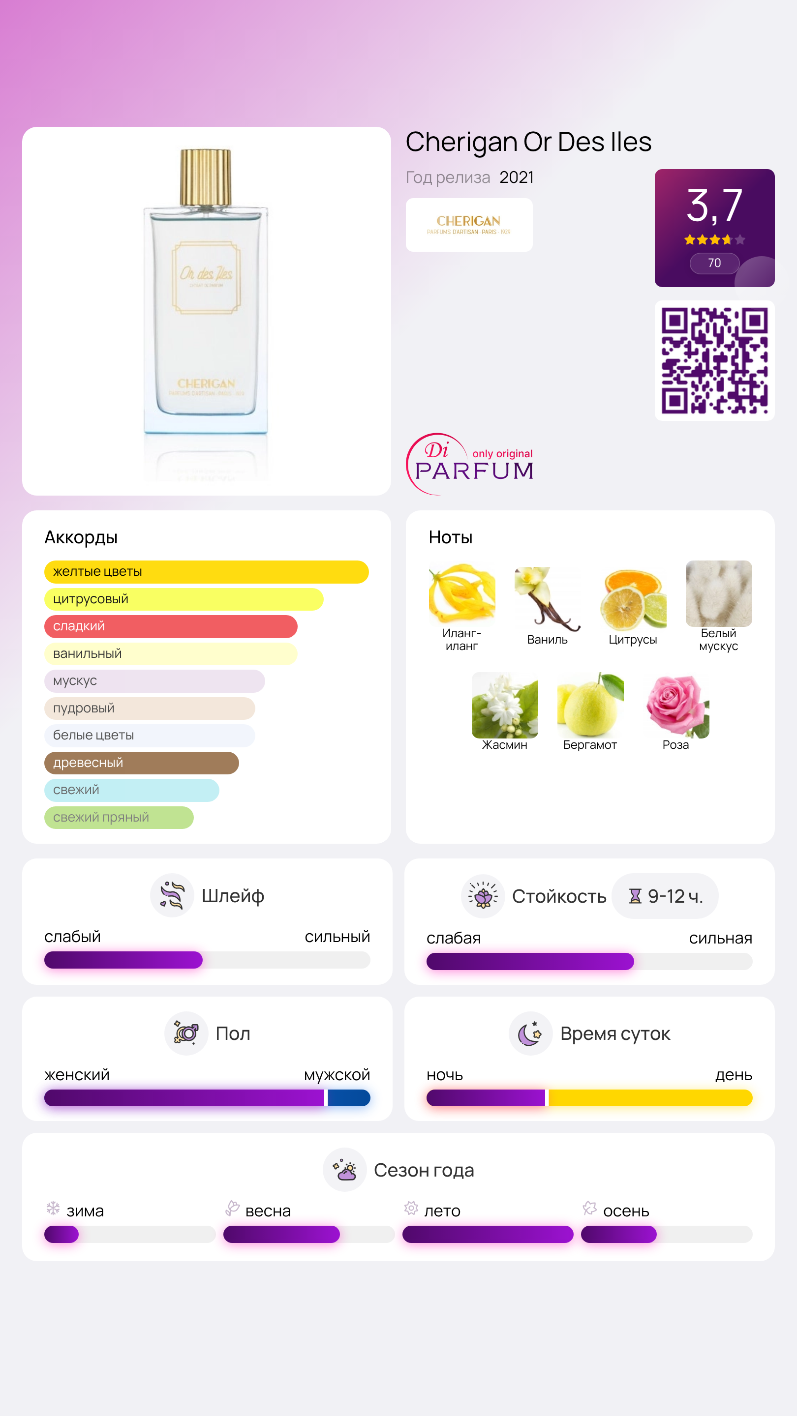 Цитрусовые ноты и бергамот в аромате Cherigan Or Des Iles создают целомудренное настроение, позволяя успокоить торопливый пульс и ощутить легкий ветерок, развевающий волосы и омывающий лица морским бризом.