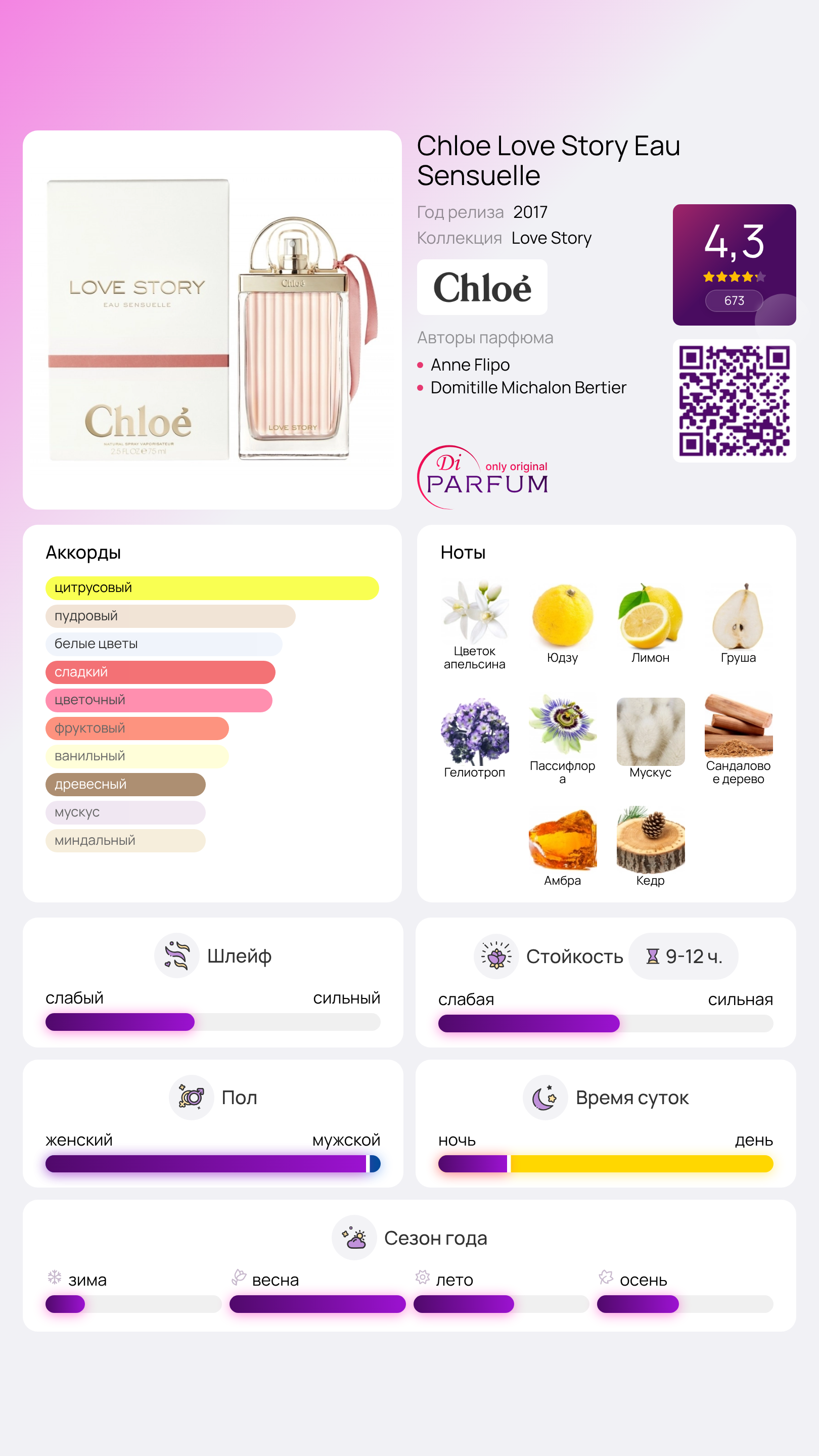 Каждая любовь уникальна, но у всех влюбленных есть сходные моменты. Удивительная радость и трепет первых свиданий, великолепные букеты цветов и воздух, наполненный весенними ароматами – парфюмеры Anne Flipo и Domitille Bertier воплотили все эти чувства в своем цветочном аромате для женщин под названием Love Story Eau Sensuelle от Chloe.