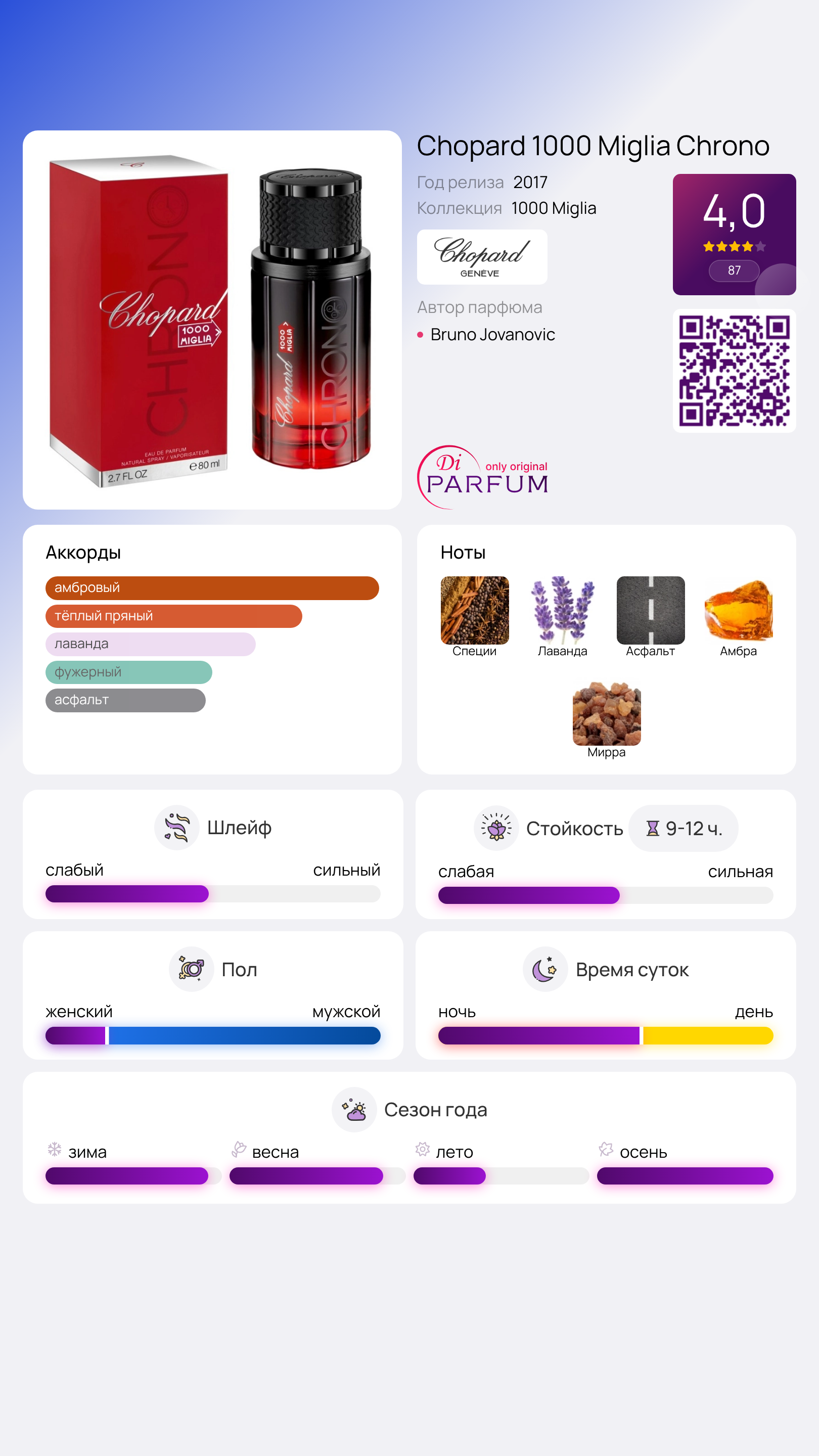 Швейцарская компания Chopard, известная своими элитными часами и хронометрами, является уважаемым спонсором соревнований на классических автомобилях. Бренд порадовал своих фанатов, выпустив серию парфюмерии. В 2017 году был представлен мужской аромат 1000 Miglia Chrono, который принадлежит к восточно-пряной группе. Формулу парфюма разработал Bruno Jovanovic, придавая этой версии "Человека тысячи миль" уникальную энергетику.