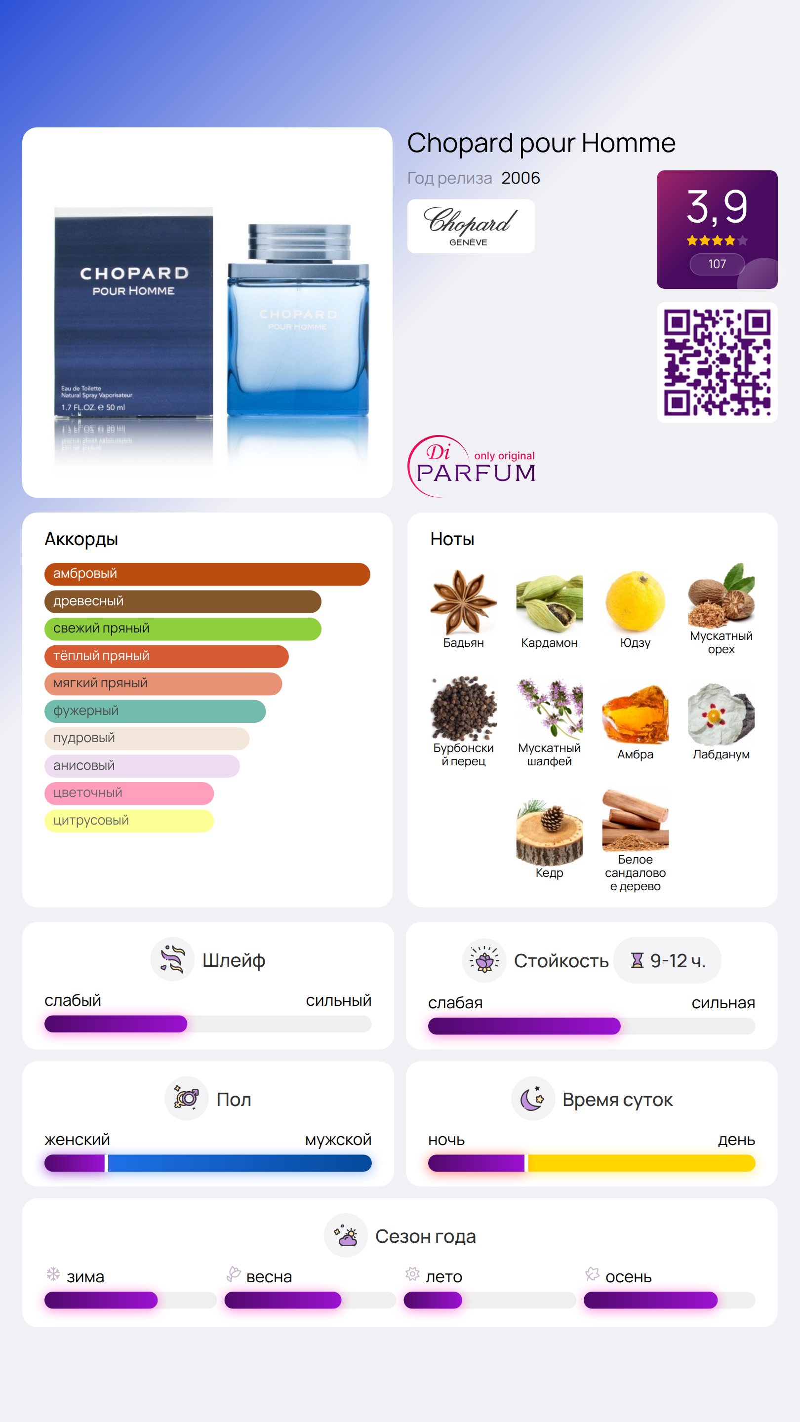 Аромат Chopard pour Homme для мужчин олицетворяет современный стиль, элегантность и яркую индивидуальность. Он предназначен для тех, кто выделяется из толпы и стремится к новым приключениям. Эти мужчины увлекаются гонками на высоких скоростях, а каждый день для них — возможность открыть нечто новое. Они ценят искусство и передовые технологии, обладают харизмой и привлекательностью.