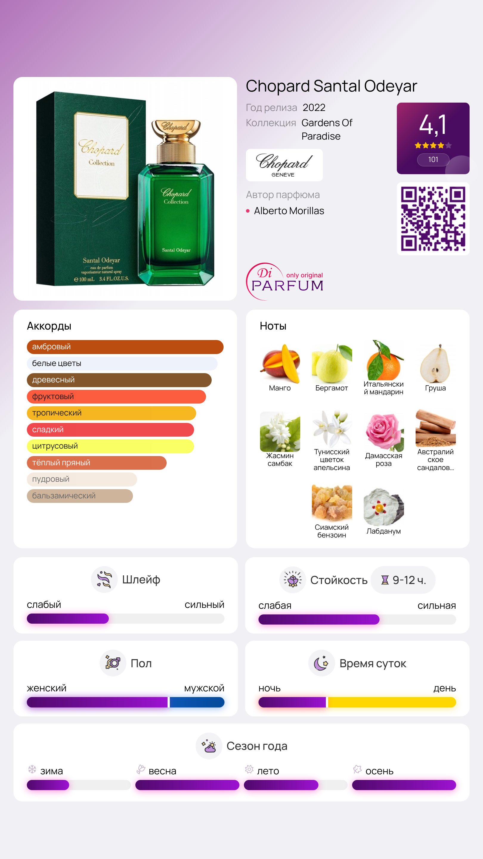 Завершает композицию лабданум в виде абсолюта шиповника и теплый, смолистый бензоин. Santal Odeyar от Chopard, выпущенный в 2022 году в рамках коллекции Master of Woods, был представлен на 75-м Каннском кинофестивале. Этот парфюм от швейцарского бренда создает обволакивающее ощущение, вызывая состояние радости и эйфории.