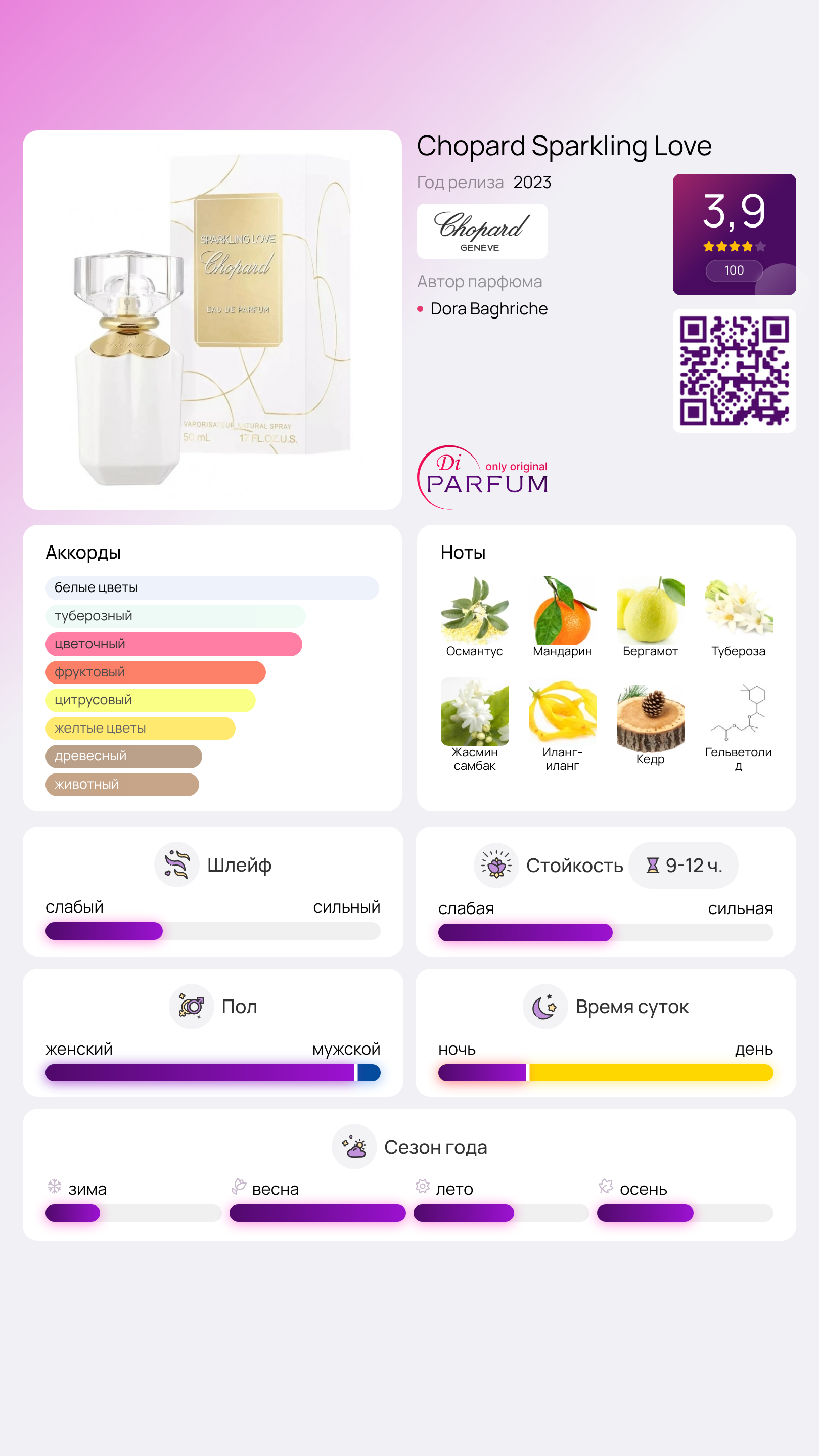 Создателем аромата Chopard Sparkling Love стала талантливая Дора Багриш-Арно. Флакон парфюма выполнен в элегантном белом цвете и украшен прозрачной крышкой, выполненной в форме крупного бриллианта.