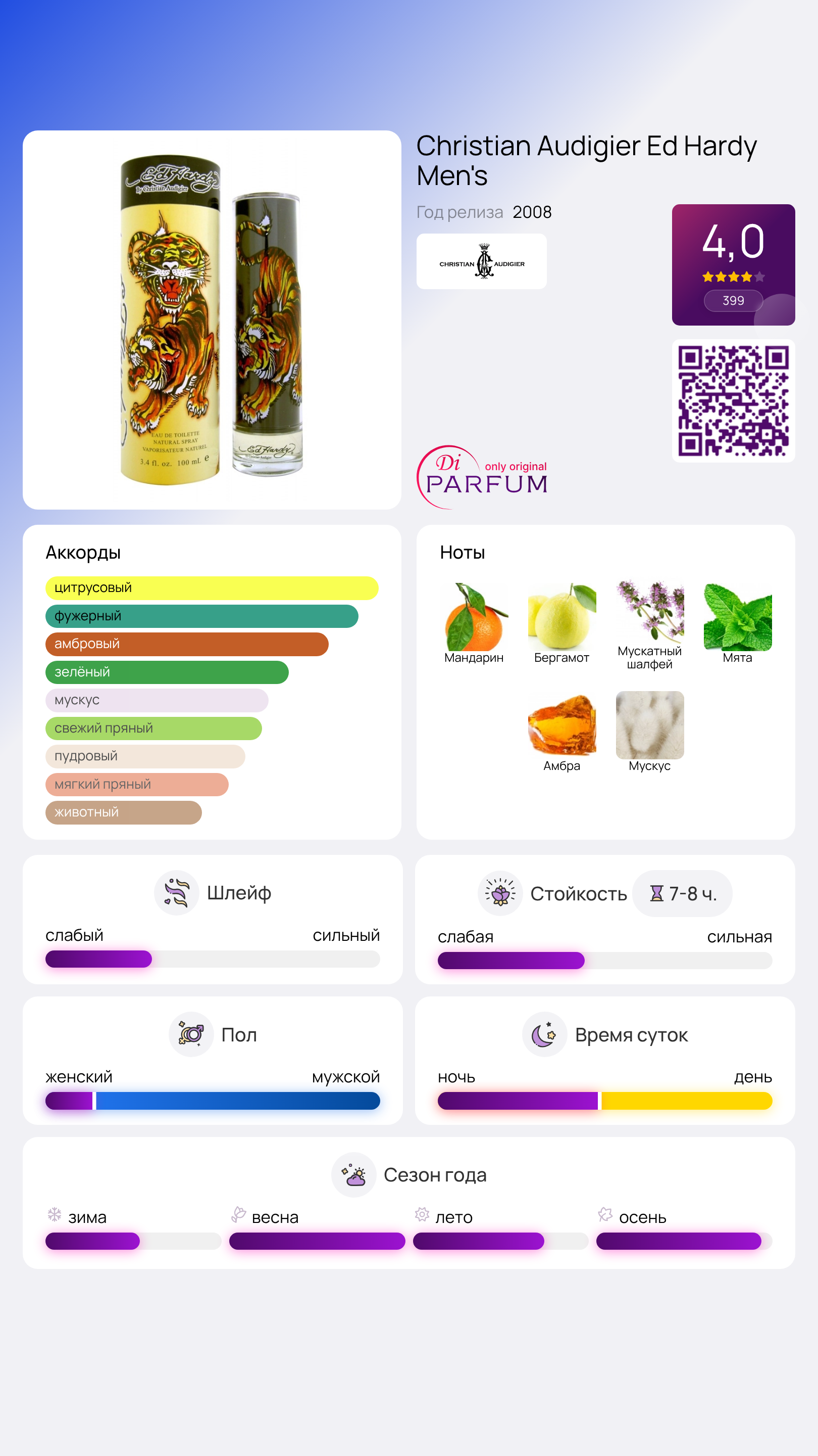 Шлейф аромата раскрывает восточную сущность, присущую "животному" мускусу и волнующей амбре. Композиция Ed Hardy Men's от Christian Audigier привлекает множество комплиментов в любых ситуациях, независимо от возраста своего владельца. Этот аромантичный мужчина всегда остается молод душой и шагает в ногу со временем, удивляя и очаровывая, как настоящий тигр в гневе. Станьте идеалом для своей мужской компании!
