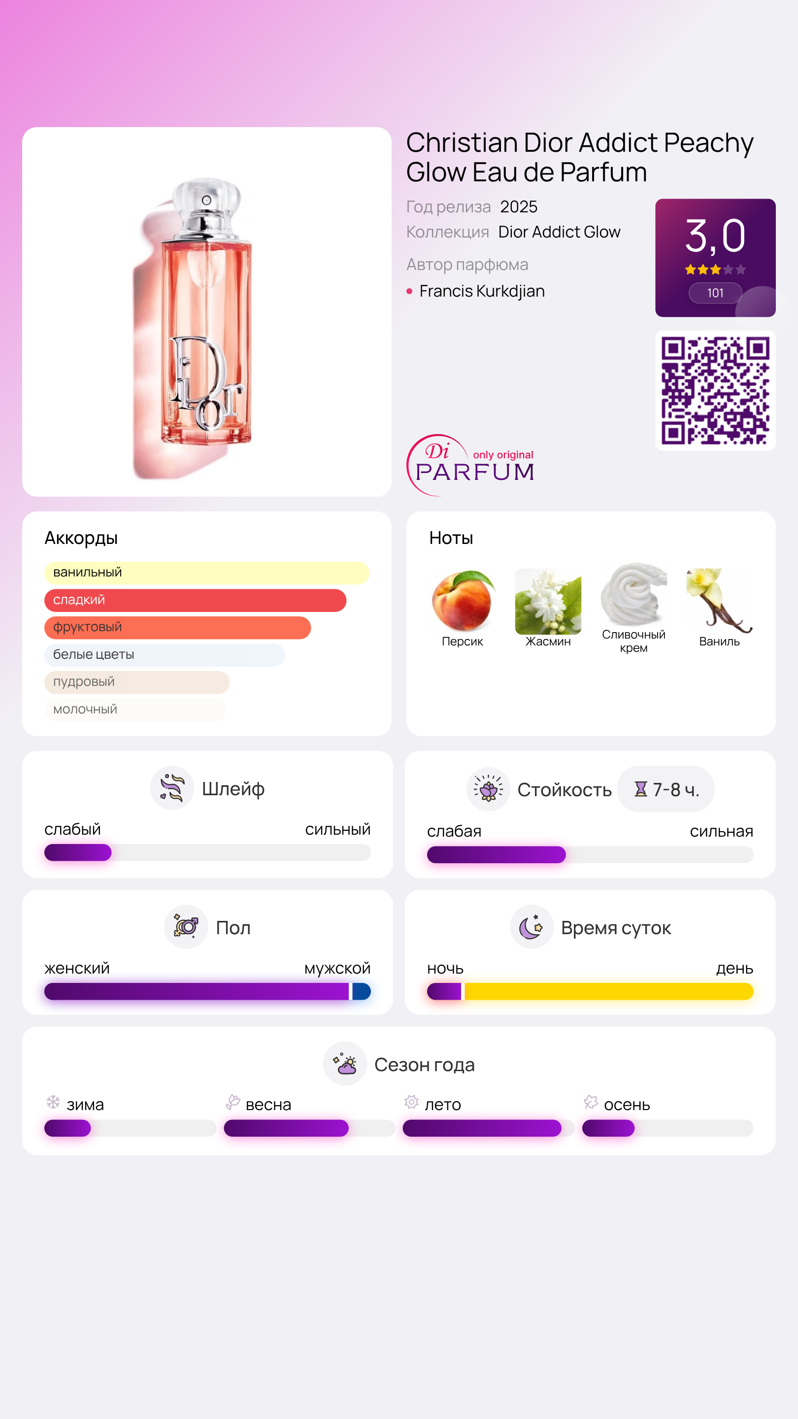 Addict Peachy Glow Eau de Parfum от Dior – это новый аромат, принадлежащий к семейству цветочных фруктовых гурманов, который был представлен в 2025 году. За его создание отвечает известный парфюмер Francis Kurkdjian. Вверхний нота раскрывается сочным персиком, переходя в сердце аромата, наполненное элегантным жасмином. Завершают композицию взбитые сливки и сладкая ваниль, создавая неповторимый гурманский шлейф.