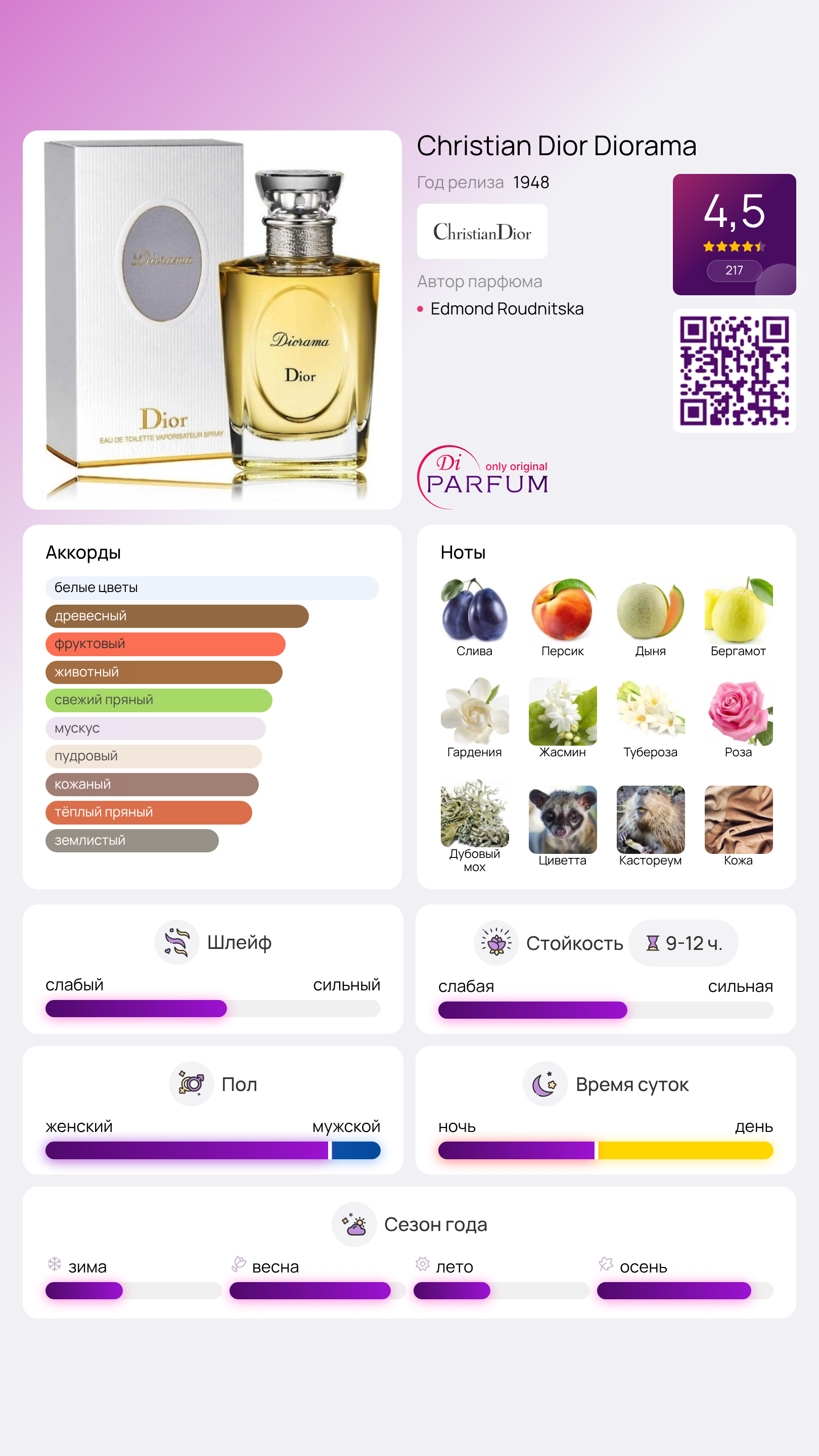 Этот смелый и соблазнительный парфюм наполнен летними солнечными акцентами, где сочетаются яркие ноты пряных фруктов и сладковатая горечь садовых цветов. Обновленный Diorama воссоздает атмосферу женских будуаров, где экстравагантность и провокация гармонично сочетаются с тайной и очарованием их владелиц.
