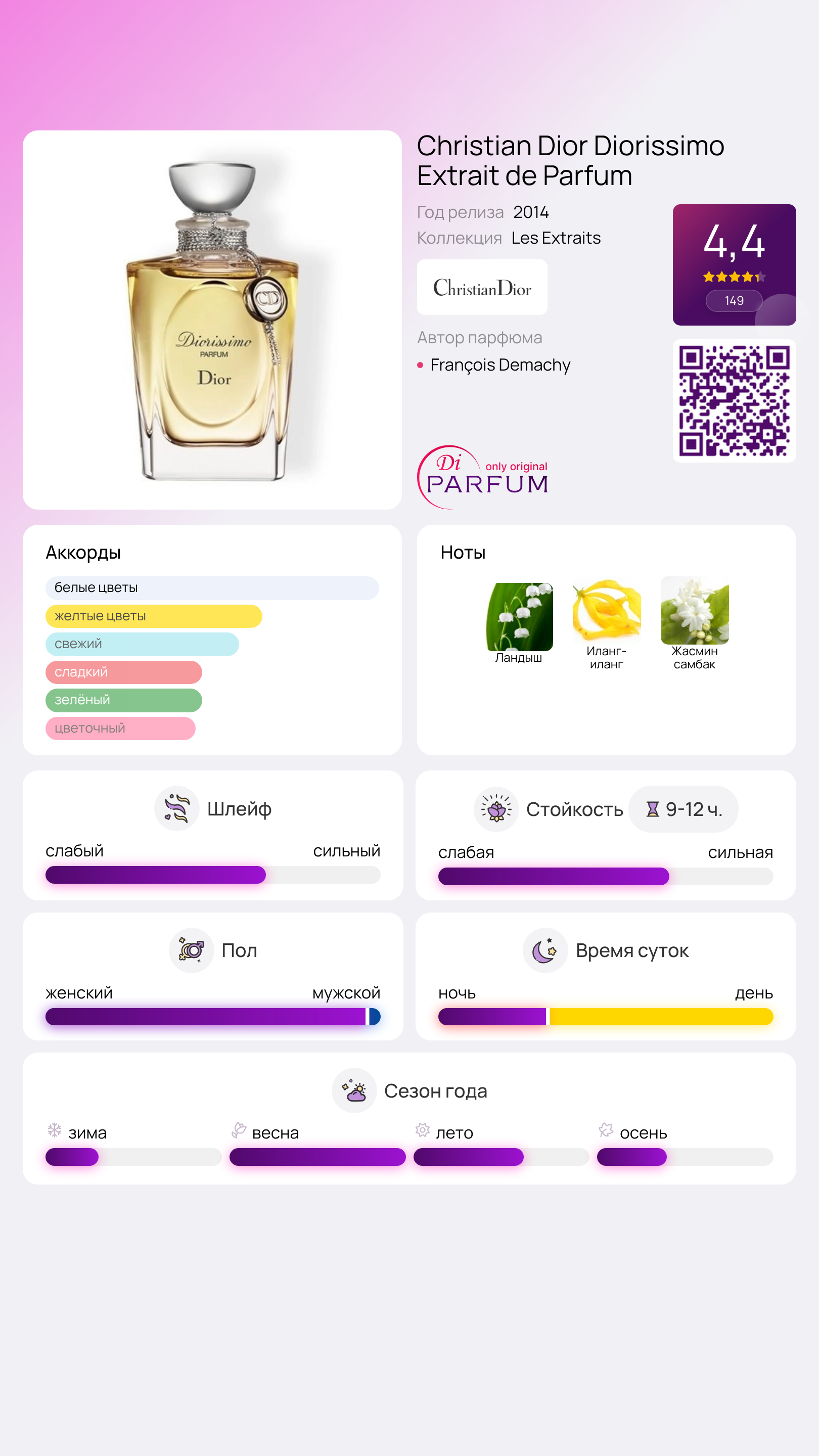 Коллекция парфюмов Christian Dior Parfum, основанная на концентрированных смесях ингредиентов, включает в себя пять уникальных ароматов. Среди них выделяется Diorissimo Extrait de Parfum, который оставляет незабываемое впечатление. Восклицаешь: "Браво, Diorissimo!" когда встречаешь этот живой парфюм. Он наполнен яркостью, изяществом и солнечностью, благодаря автору Франсуа Демаши, который создал его всего из трех нот.