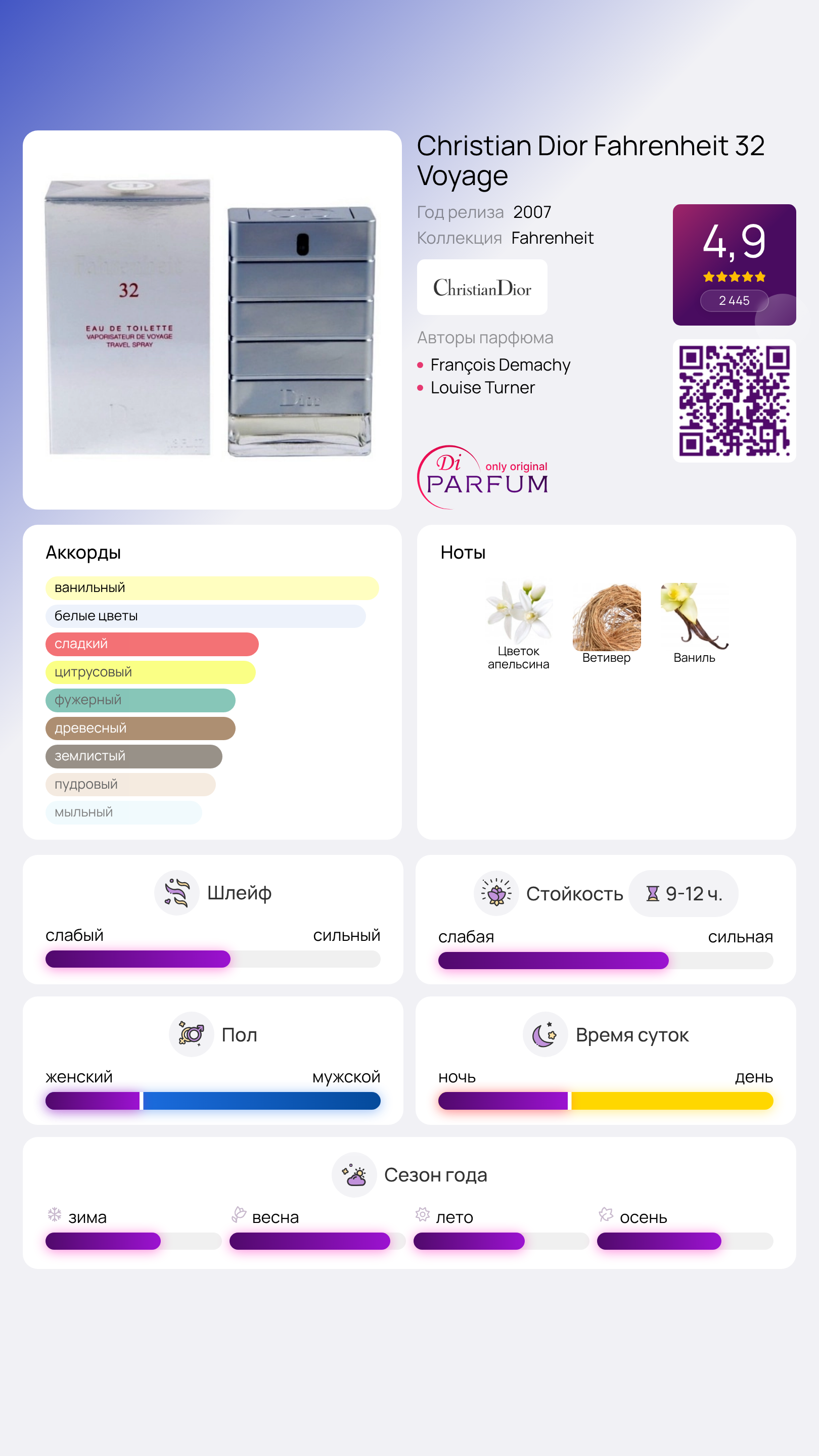 Аромат Fahrenheit 32 Voyage от Christian Dior представляет собой уникальное продолжение классического парфюма Fahrenheit, выпущенного в 1988 году. Этот мужской парфюм завораживает своей чувственностью и свежестью, что делает его идеальным выбором для современного мужчины.
