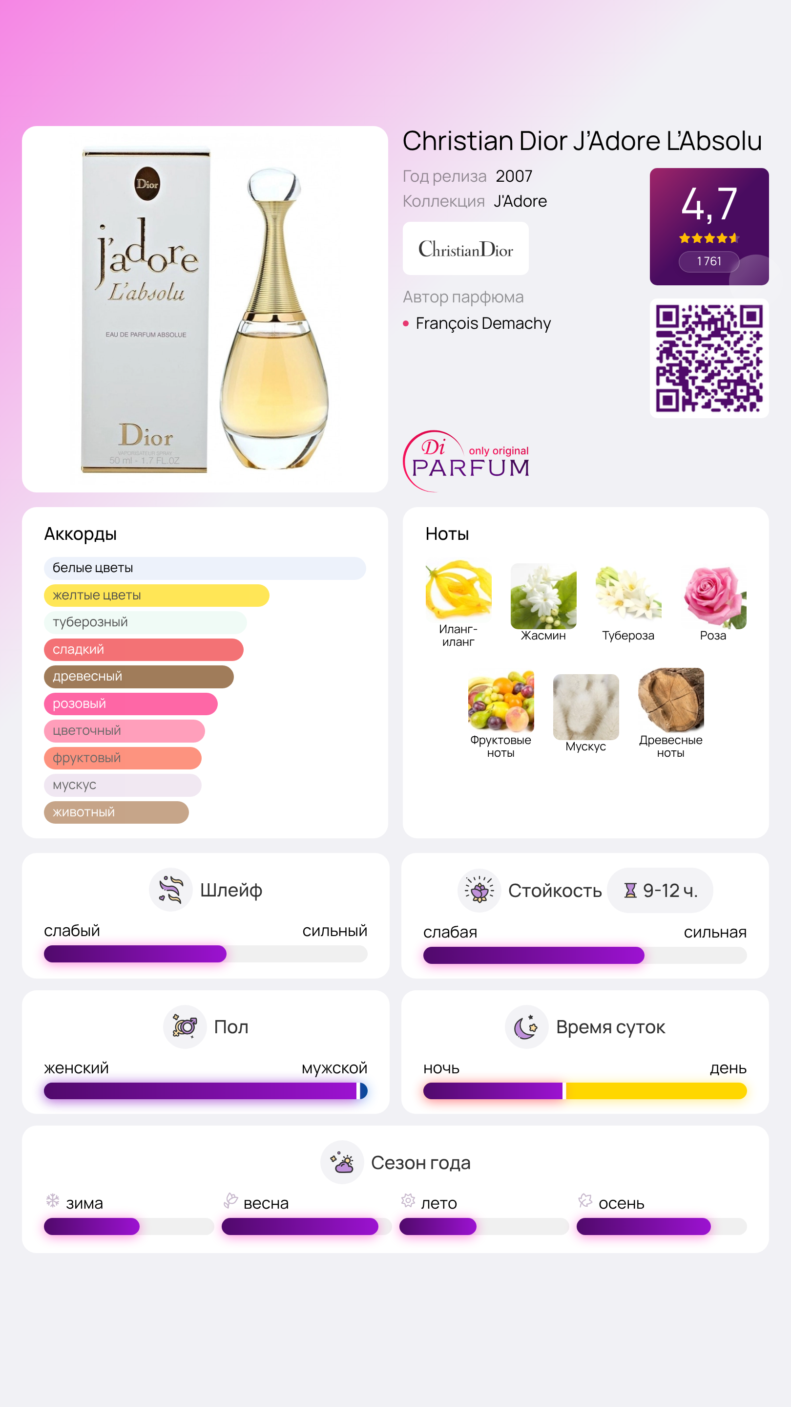 Данный аромат прекрасно подходит как для дневной активности, так и для вечернего выхода в ресторан или романтической встречи.