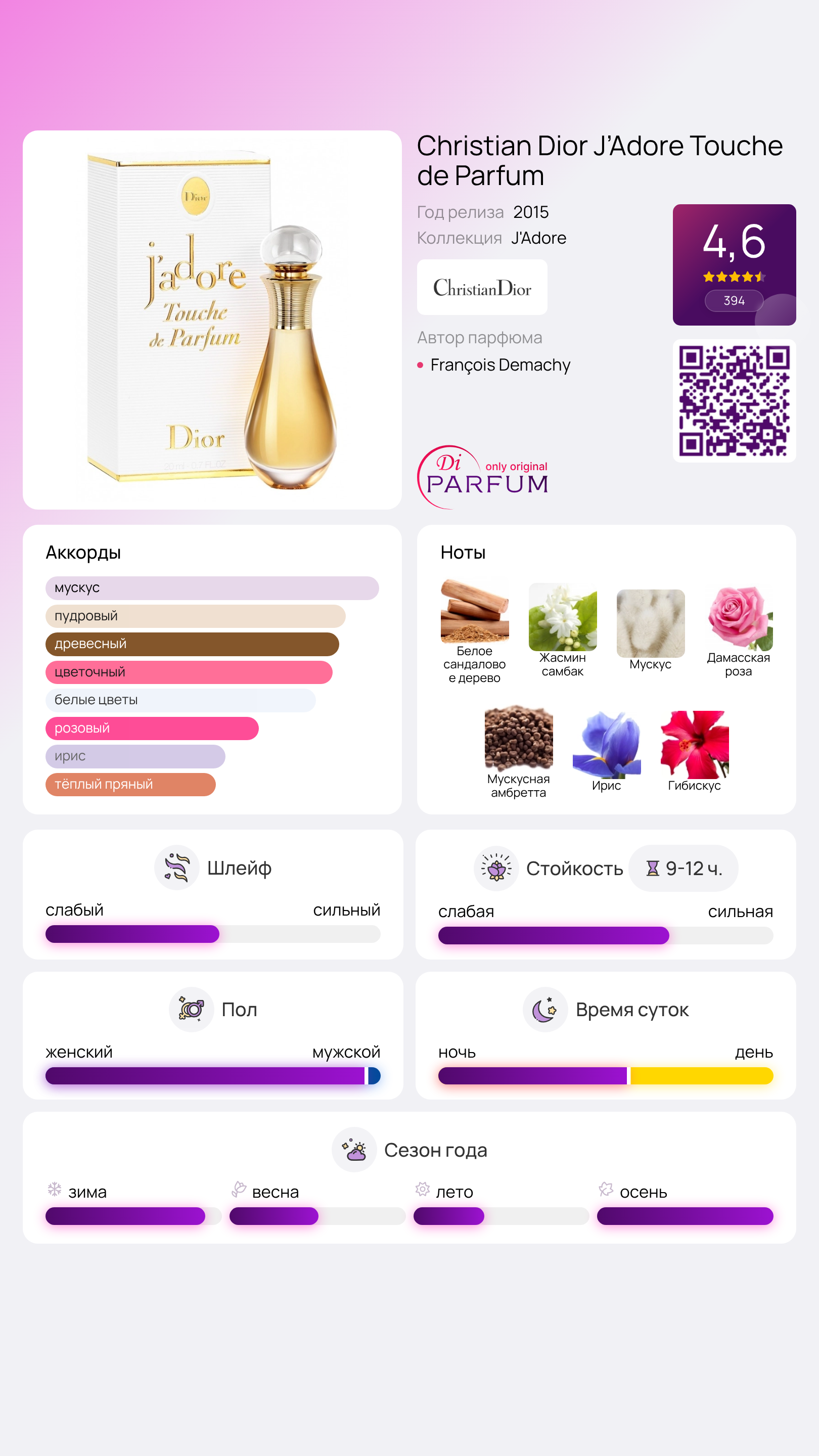 Т parfum J’adore Touche de Parfum является символом женственности и утонченного стиля. Выпущенный в 2015 году, этот цветочно-древесный аромат стал новым шедевром в известной парфюмерной коллекции J’adore от Dior. На его создание трудилась креативная энергия Француа Демаши, который отметил, что этот аромат является шагом в будущее для парфюмерии.