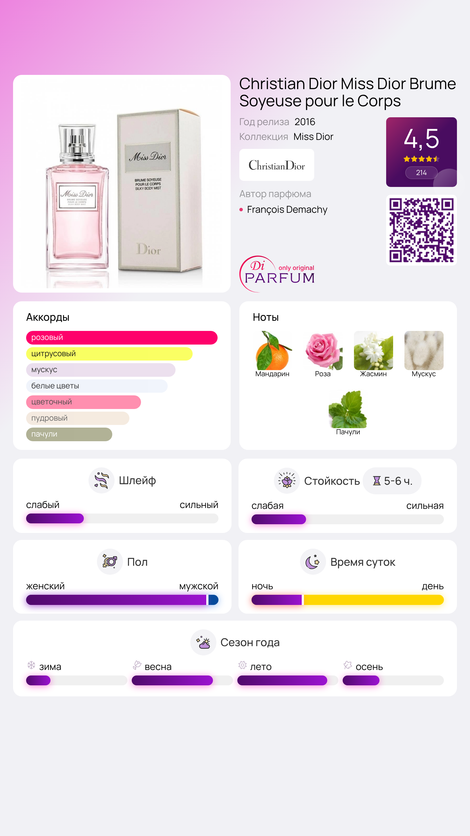 Miss Dior Brume Soyeuse - магнетически привлекательная парфюмерная вода, выпущенная знаменитым французским брендом. В пресс-релизе сказано, что данный аромат прекрасно сочетается с аналогичным увлажняющим мистом pour le Corps Fragrance Mist. Это идеальный выбор для летнего периода. Нежно-розовый хрустальный флакон аккумулирует кристальную легкость, подчеркивая ощущение чистоты без мыльных нот.