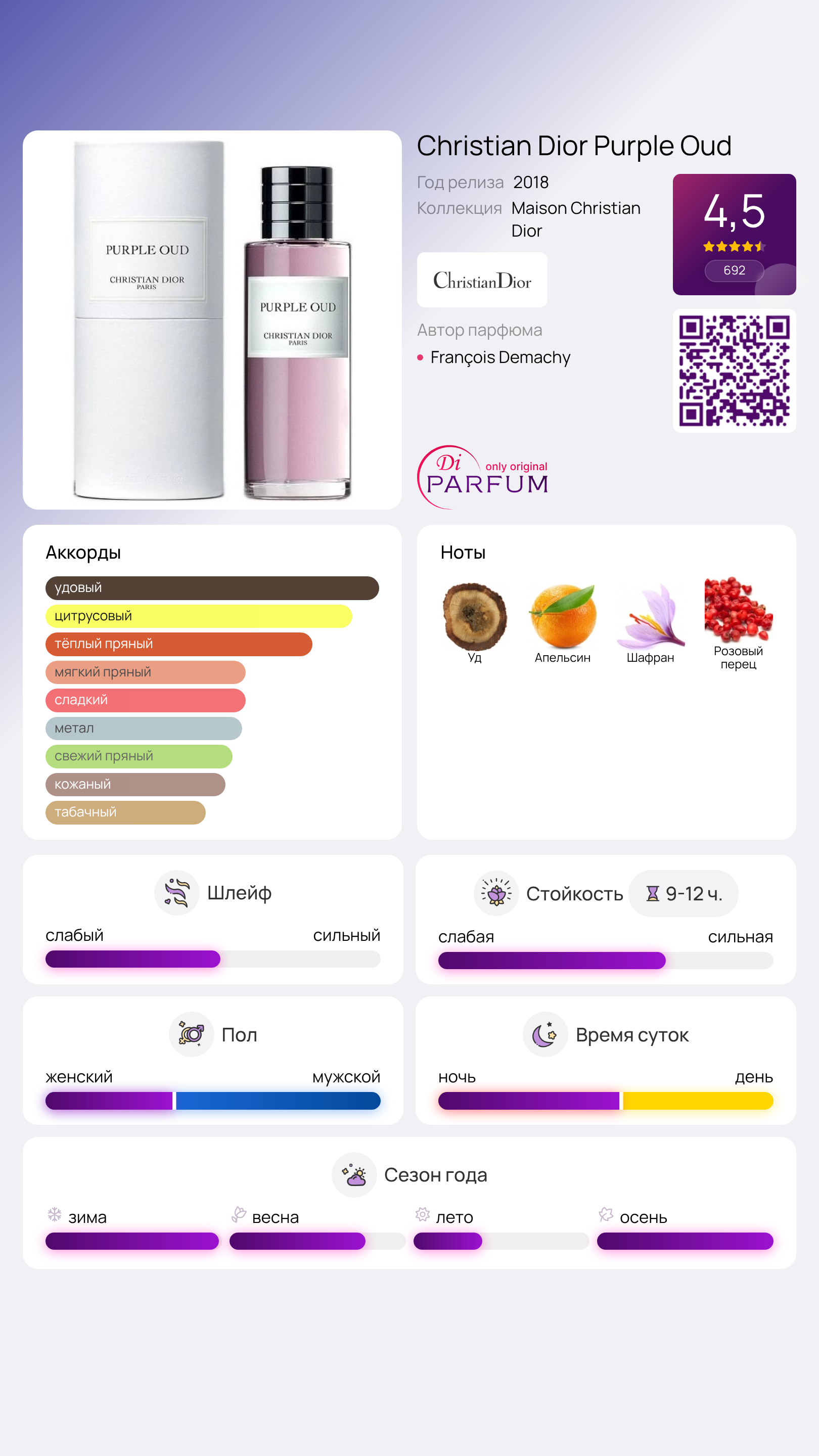 Специи изящно обрамляют цитрусовые элементы, представленные ярким солнечным апельсином. Уникальная композиция Purple Oud была представлена в 2018 году и сразу же стала самым коммерчески успешным Удом в парфюмерной коллекции Collection Privee от всемирно известного французского бренда. Этот аромат можно назвать классикой современности, созданной из исключительных компонентов, он подходит как для мужчин, так и для женщин и не знает временных границ.