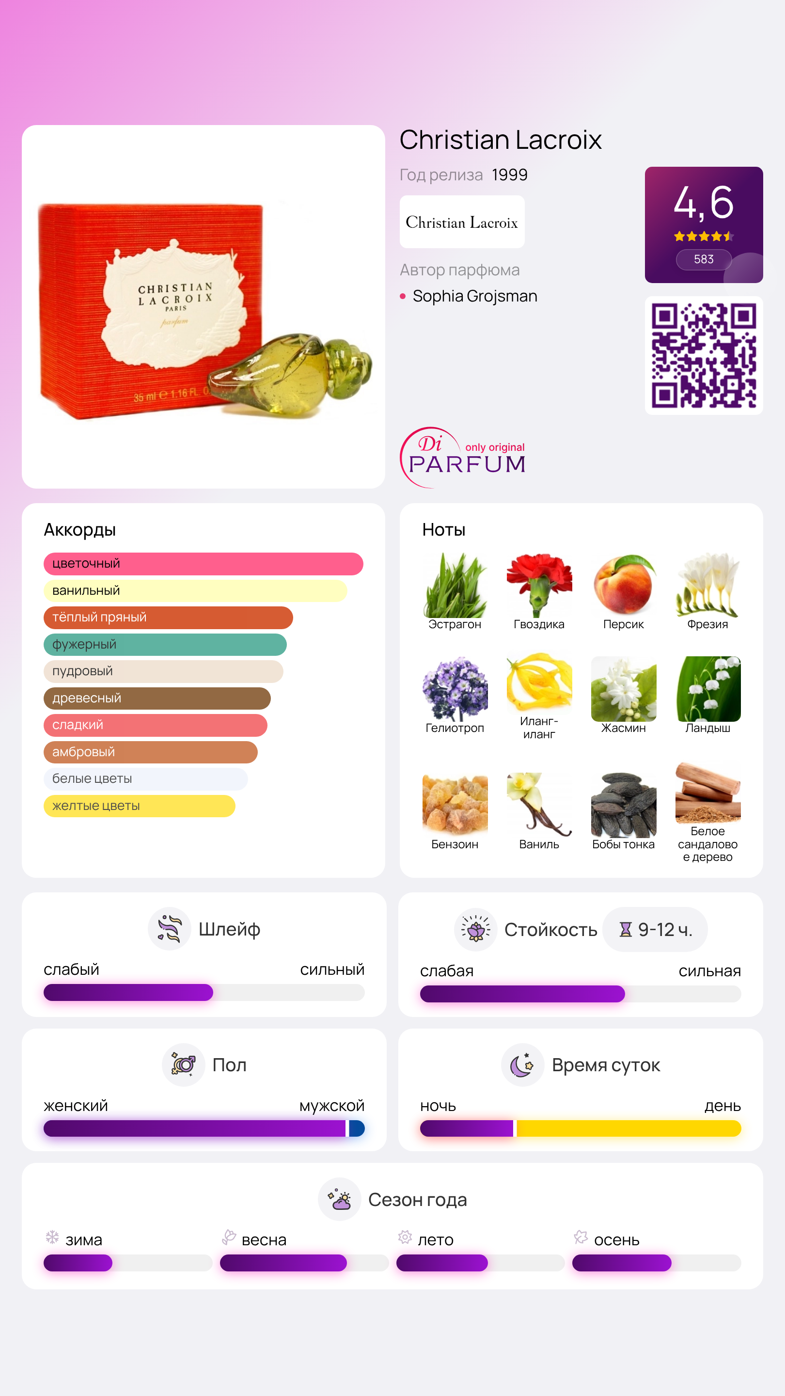 Классический цветочный парфюм от Christian Lacroix, выпущенный под именем бренда, создан для того, чтобы приносить радость. Это ощущается благодаря верхним нотам, в которых переплетаются фрезия, гвоздика и эстрагон с легким акцентом зрелого персика.
