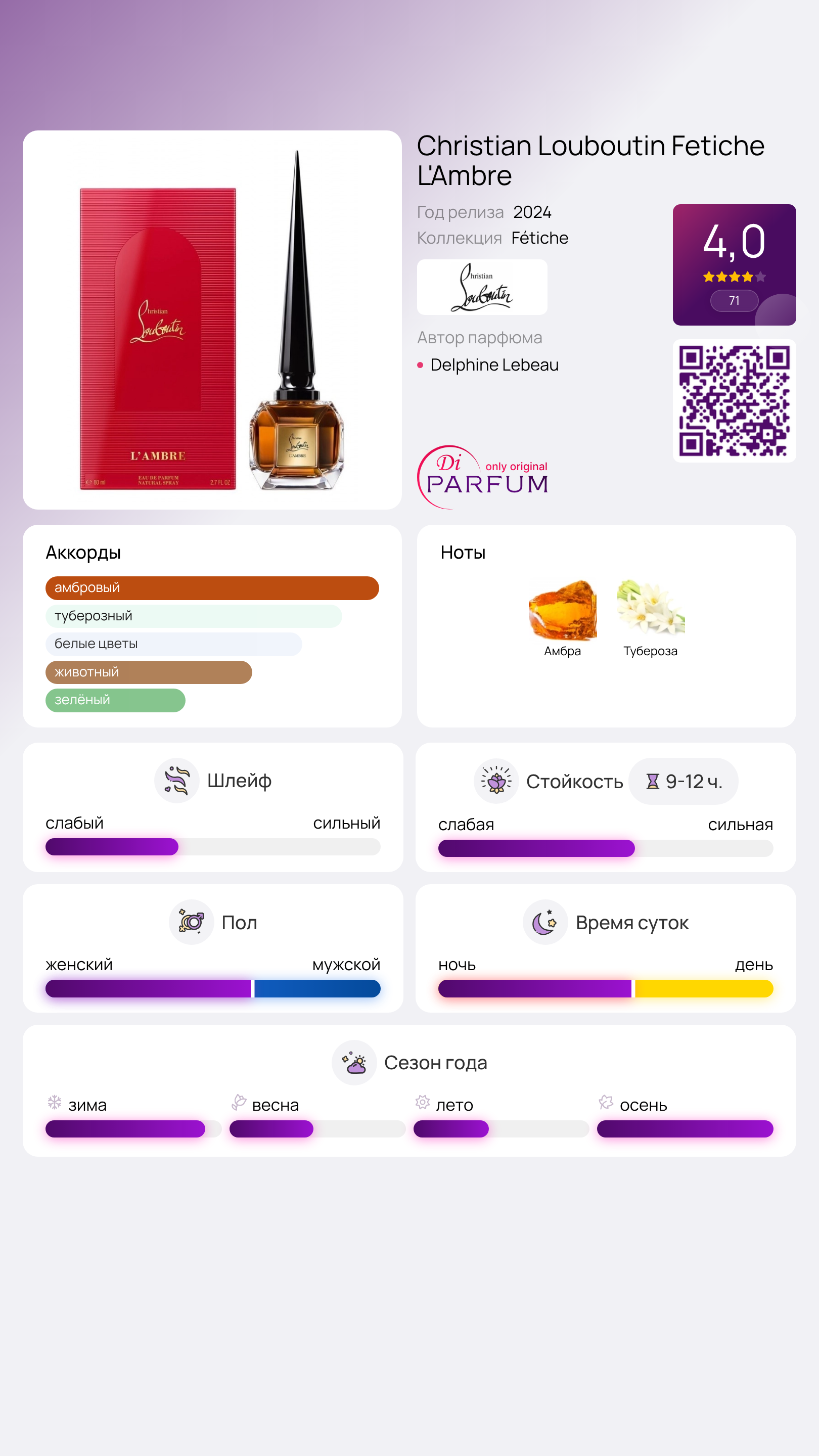 Аромат от Christian Louboutin, как и остальные парфюмы из этой коллекции, относится к категории «унисекс». Каждый из шести композиций рассчитан на то, чтобы стать новым фетишем для тех, кто соприкоснется с этим удивительным флаконом. Дизайн коллекции резонирует с ключевой особенностью бренда – острым длинным каблуком, знакомым каждой стильной женщине. Побалуйте себя соблазнительной амброй в объятиях туберозы с Fetiche L'Ambre.