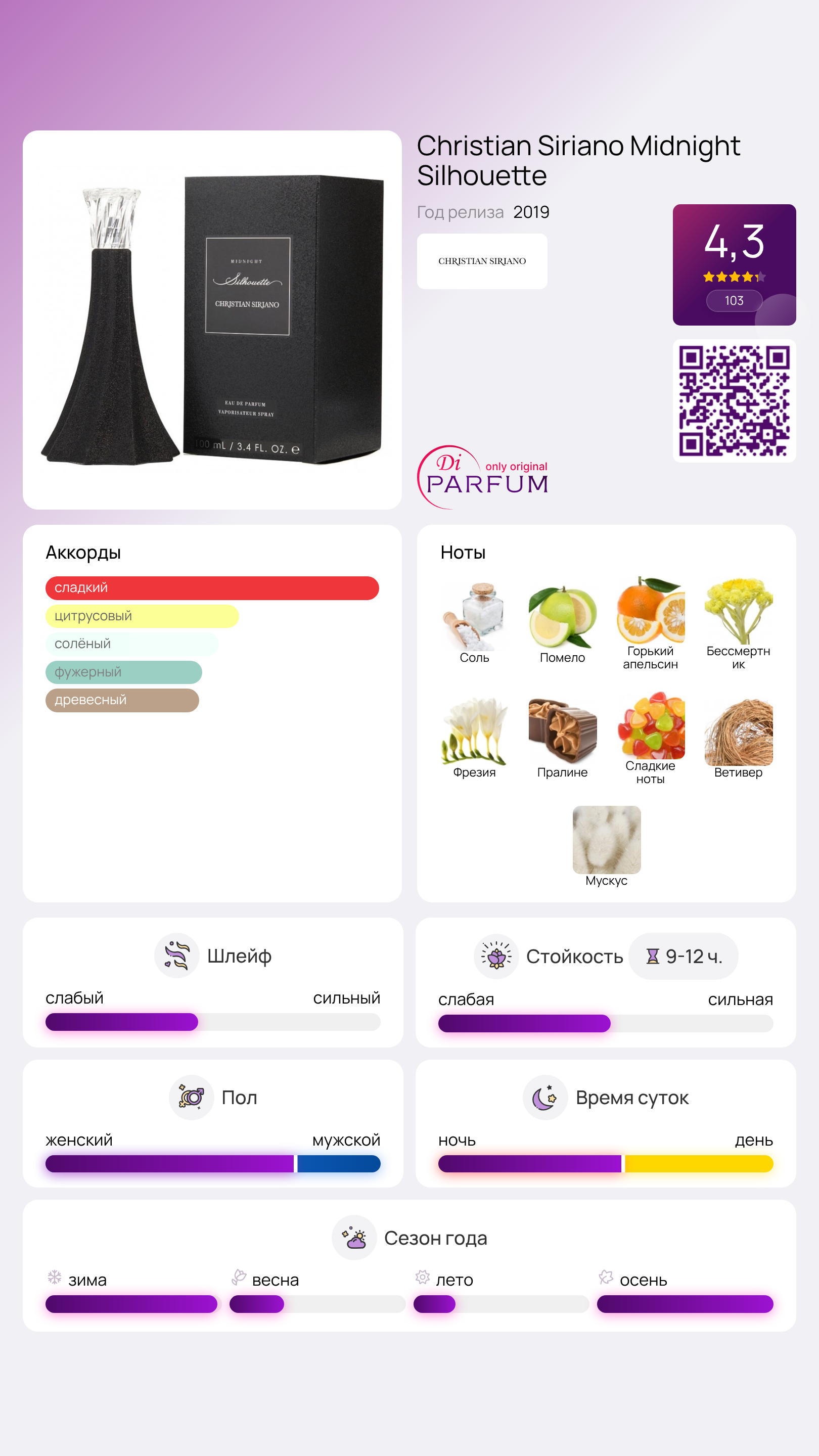 Аромат Midnight Silhouette был создан в 2019 году известным парфюмером и дизайнером роскошных женских нарядов. Флакон, выполненный из атласного стекла, напоминает элегантное вечернее платье «плиссе», которое струится по Силуэту. Матовое, дымчато-черное покрытие флакона усиливает торжественный характер этого эликсира. Это идеальный выбор для кокетливых и игривых девушек, желающих привлечь внимание мужчин.