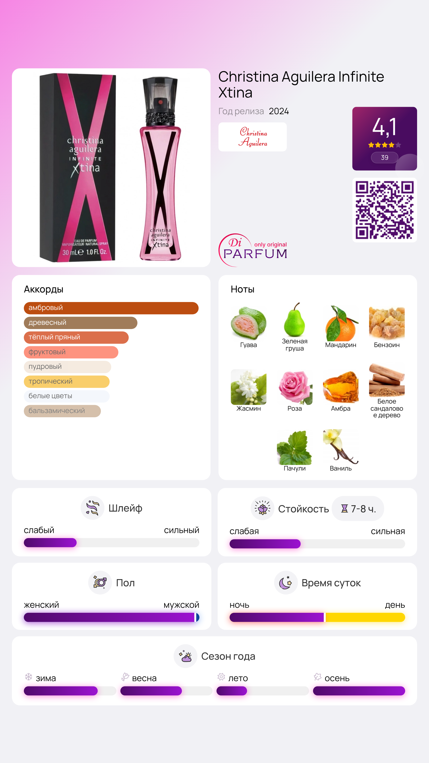 Infinite Xtina от Christina Aguilera — это восточно-цветочный аромат для женщин, который стал доступен в 2024 году. Данная композиция была разработана и представлена брендом Revlon Inc. Это оригинальный аромат, который идеально подходит для уверенных в себе женщин, стремящихся выделиться среди остальных.