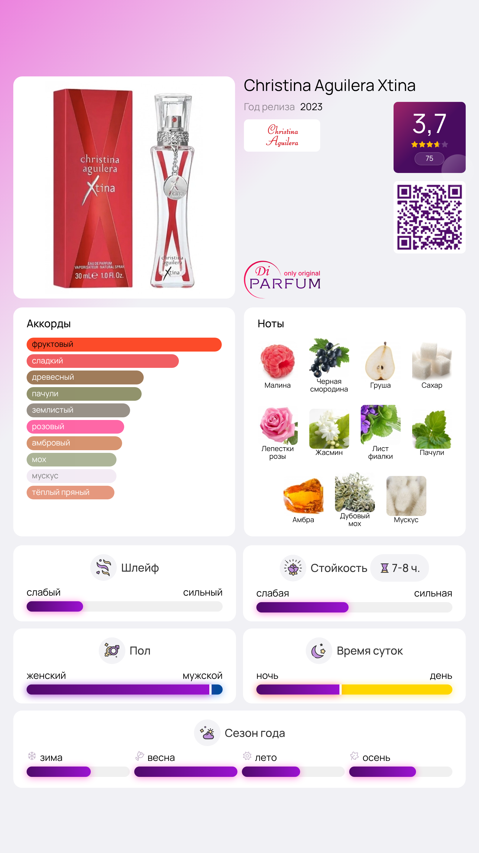 Xtina от Christina Aguilera — это новый цветочно-фруктовый аромат для женщин, который был представлен в 2023 году. В верхних нотах звучат малина, черная смородина и груша, в сердце композиции — сахар, лепестки роз, жасмин и листья фиалки, а в базовых нотах раскрываются пачули, амбра, дубовый мох и мускус.