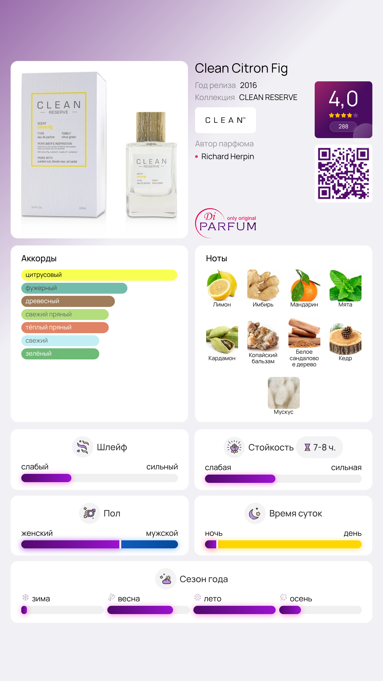 Citron Fig от Clean — это цитрусовый аромат, созданный как для женщин, так и для мужчин. Выпущенный в 2016 году, этот парфюм стал настоящим открытием благодаря удивительной игре нот и свежести. Парфюмером, стоящим за созданием Citron Fig, является известный Richard Herpin.