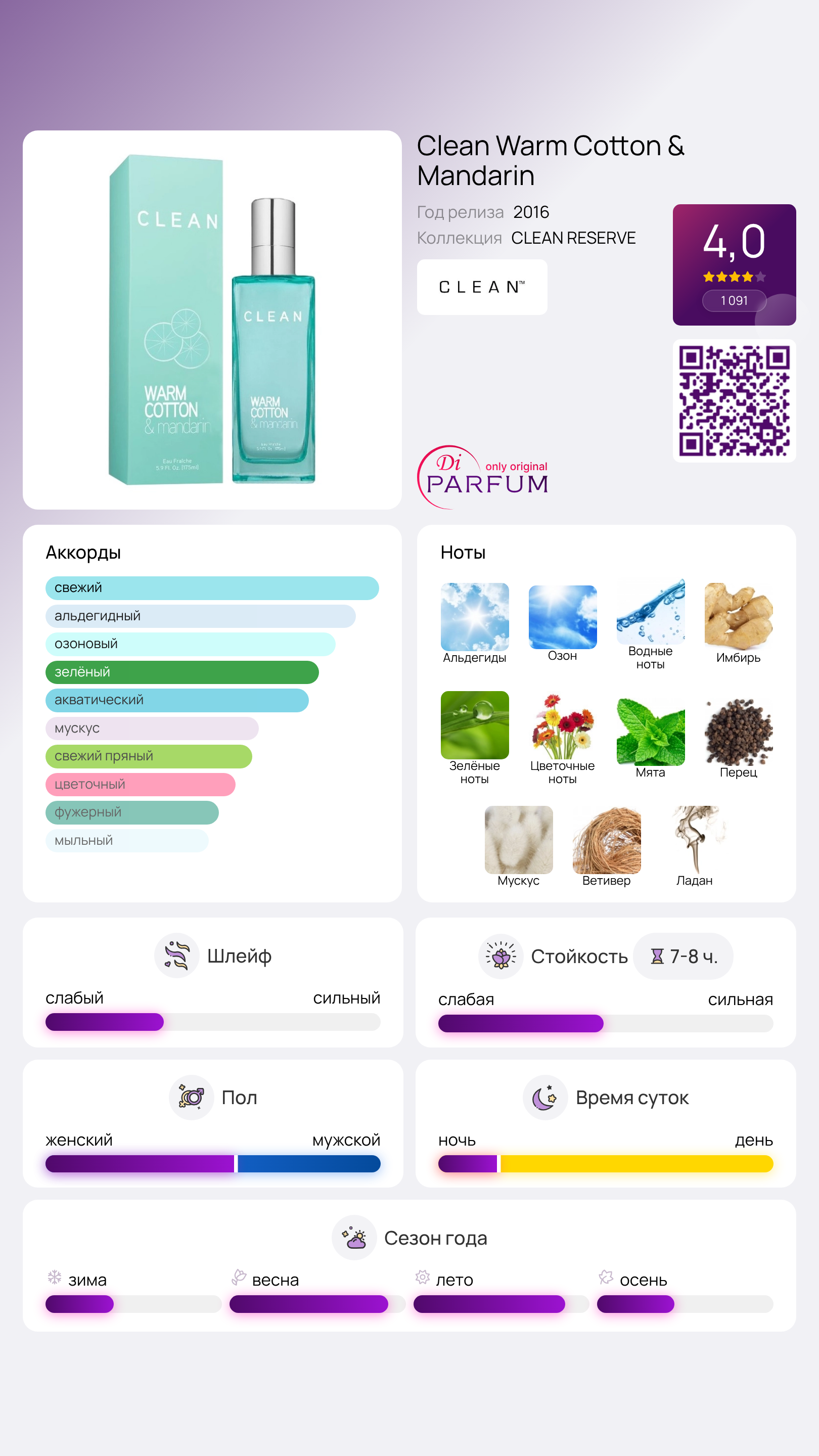 Шлейф аромата обрамлен амброво-мускусными акцентами и аккордом кожи, что придаёт парфюму уникальное звучание. Легкость и свежесть Clean Warm Cotton & Mandarin особенно ценятся в теплые весенние и летние дни. Этот аромат отлично подходит для повседневного использования, как в офисе, так и в вечерних развлекательных заведениях.