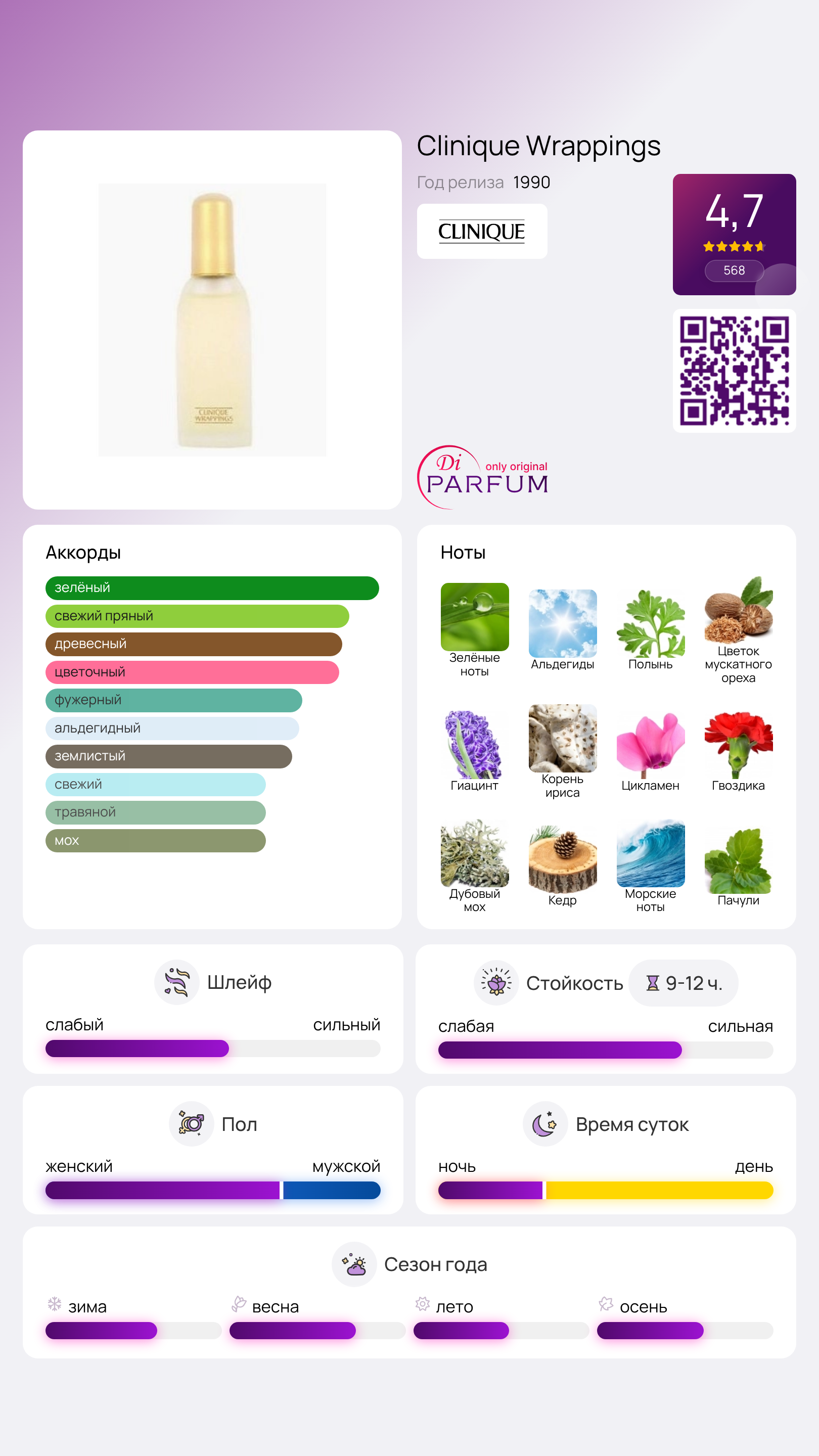 Концепция аромата Clinique Wrappings заключается в том, чтобы дополнить образ, создаваемый одеждой, при помощи уникального букета запахов. В его составе присутствуют разнообразные ингредиенты, включая базилик, артемизию, жасмин, гиацинт, кипарис, ветивер и дубовый мох. Аромат Clinique характеризуется как лёгкий, свежий, чистый и оригинальный.