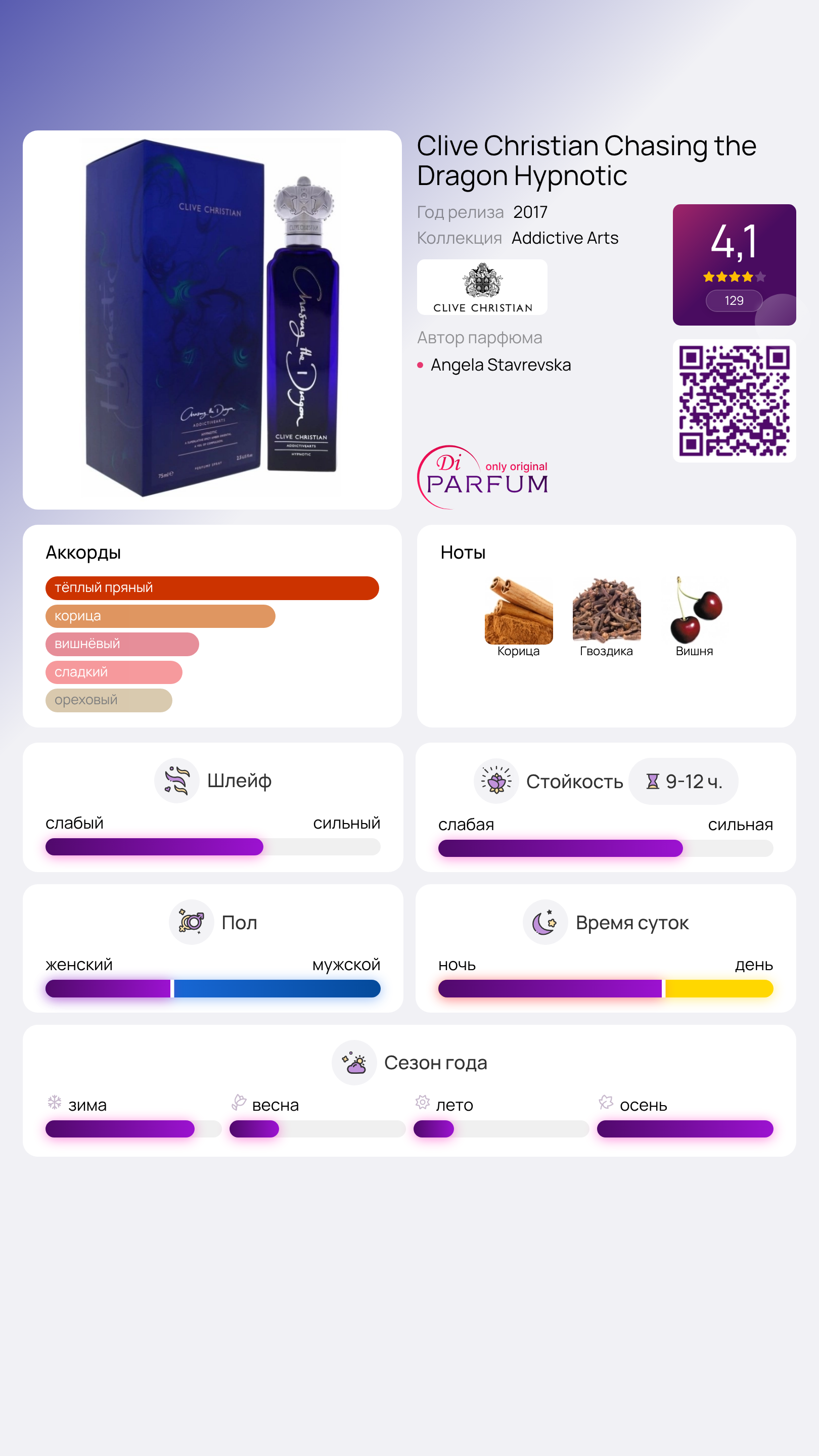 Chasing the Dragon Hypnotic от Clive Christian представлен в концентрации 25%, и адресован тем оптимистам, которые наслаждаются путешествиями и яркими впечатлениями. Духи созданы с использованием уникальной технологии headspace, которая недоступна другим брендам. Перфумер Angela Stavrevska смогла запечатлеть аромат уверенного в себе мужчины — истинного хозяина жизни. В 2017 году данный парфюм британской марки получил высокую оценку от критиков.