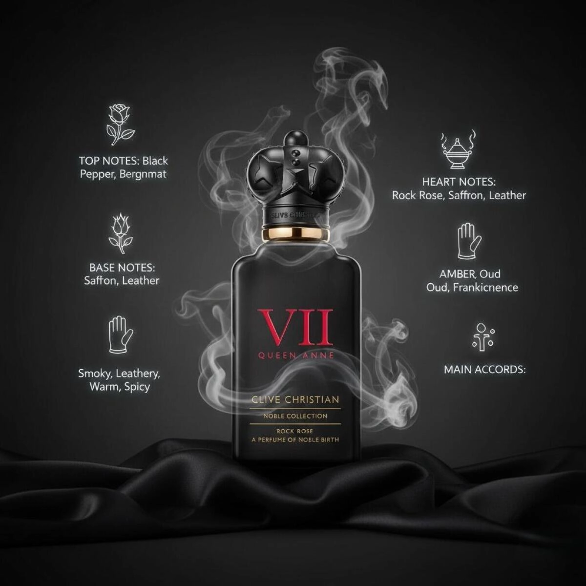 Аромат Clive Christian VII Queen Anne Rock Rose обладает мощной и уникальной энергетикой, это не просто комбинация редких и высококачественных ингредиентов, а скорее выражение определённого образа жизни и статуса. Уникальный готический черный флакон в стиле Клайва выделяется своей великолепной крышкой в виде короны и алая надписью, напоминающей королевскую мантию.