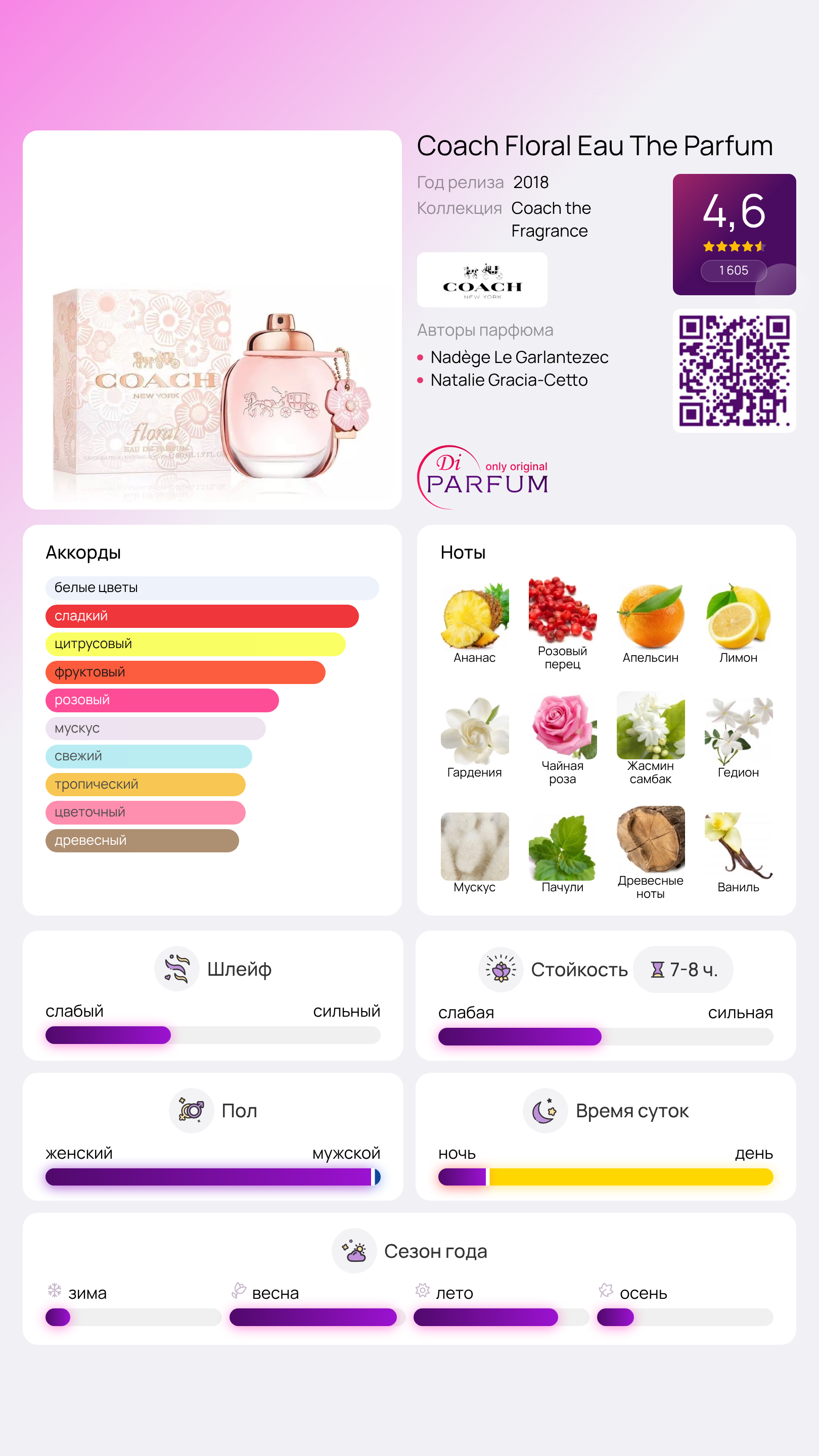 Парфюм Coach Floral Eau De Parfum представляет собой цветочный древесно-мускусный аромат, разработанный Shyamala Maisondieu, Nadege le Garlantezec и Nathalie Gracia-Cetto. В процессе создания парфюма были использованы ананас, розовые ягоды, бергамот, лимон и апельсин.