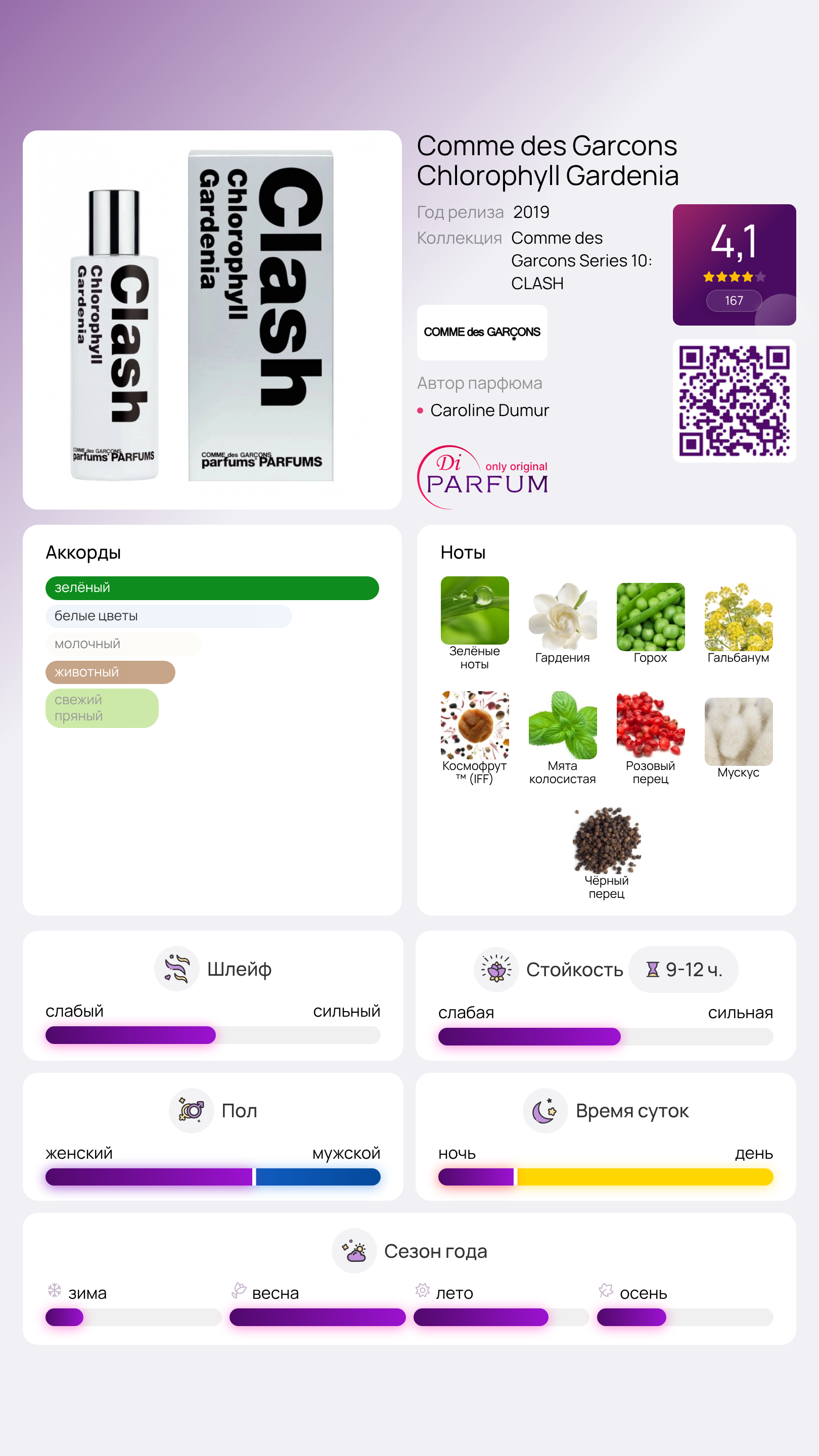 В составе следует отметить использование особого природного пигмента хлорофилла, который придает растениям зеленый цвет и играет ключевую роль в фотосинтезе. Таким образом, авторы аромата ставят акцент на важности защиты природы и растительных ресурсов. Comme des Garcons Chlorophyll Gardenia служит напоминанием о необходимости заботы об окружающей среде, ведь наше будущее зависит от этого.