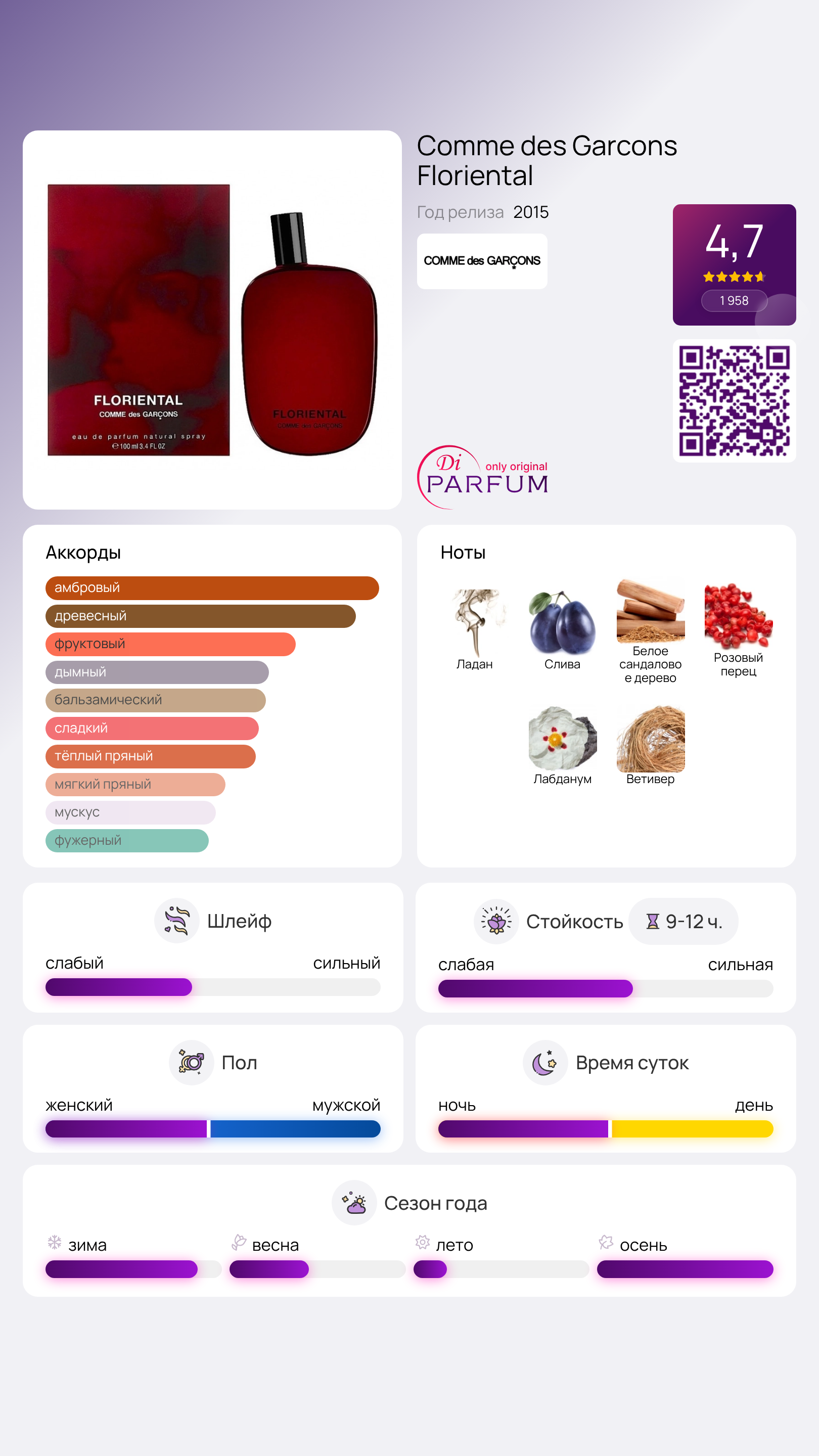 Парфюм Floriental от бренда Comme des Garcons был выпущен в 2015 году и предназначен для унисекс-использования. Он представлен в ярком флаконе с необычным дизайном.