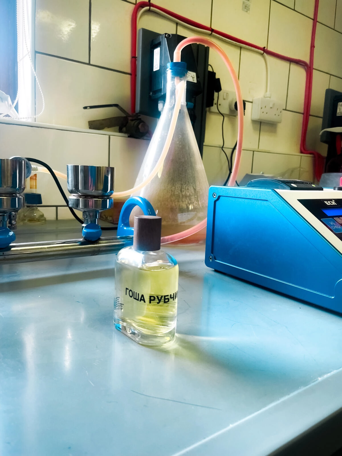 Эта парфюмерная композиция, названная Gosha Rubchinskiy, представляет собой свежий фужерный букет. Созданный с учетом молодежных предпочтений, аромат стал результатом тщательной работы парфюмера Алексиса Дадиера. Начальные ноты этого оригинального фужера из ангелики и бучу плавно переходят в сердце, в которое входят ромашка и мандарин. В завершении, в базе, сдержанно проявляются ароматические акценты таитянского ветивера, пачули и стиракса.