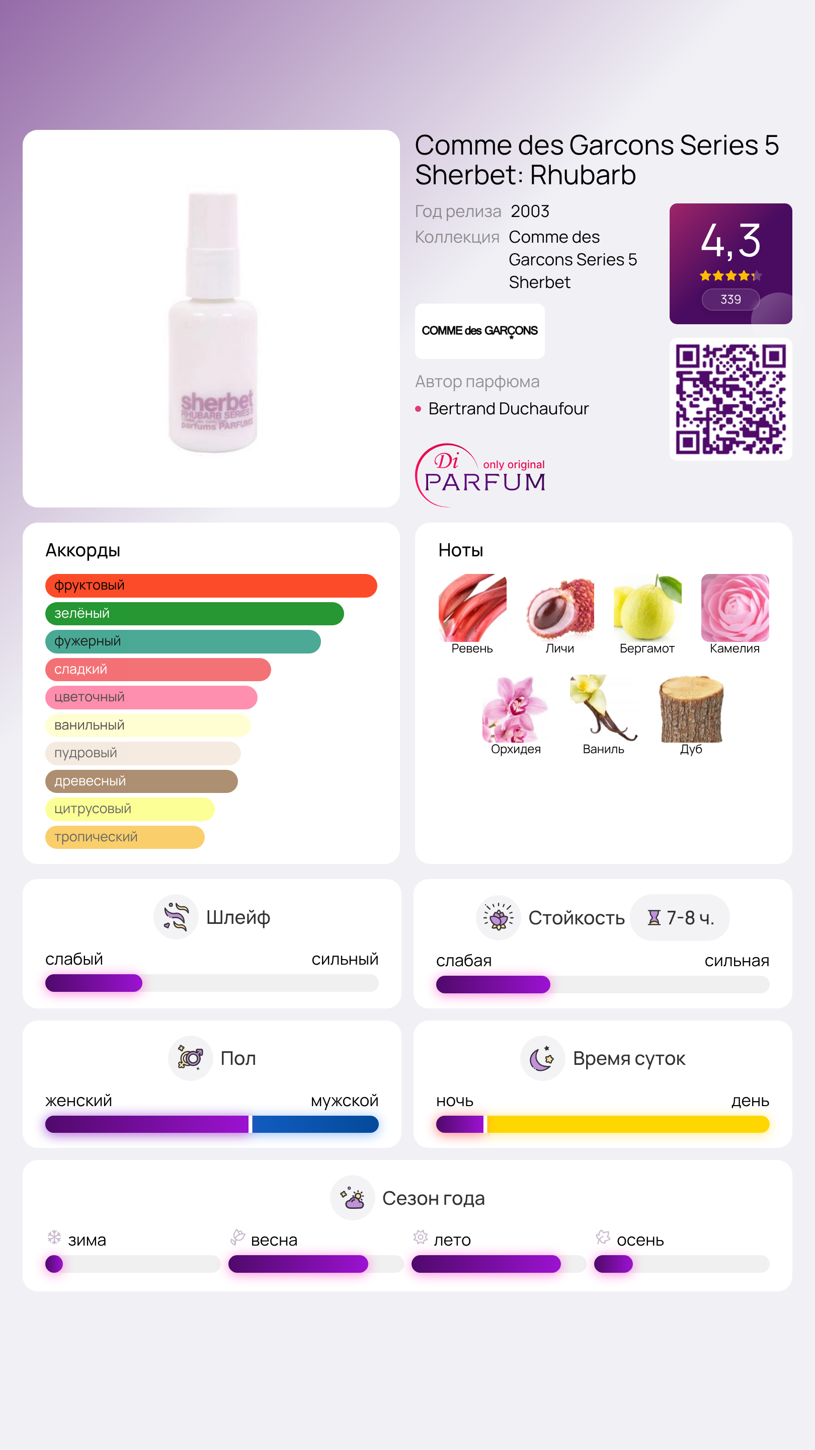 Парфюм Series 5 Sherbet: Rhubarb, созданный в 2003 году известным парфюмером Бернаром Дюшафуром для бренда Comme des Garçons, является унисекс-продуктом.