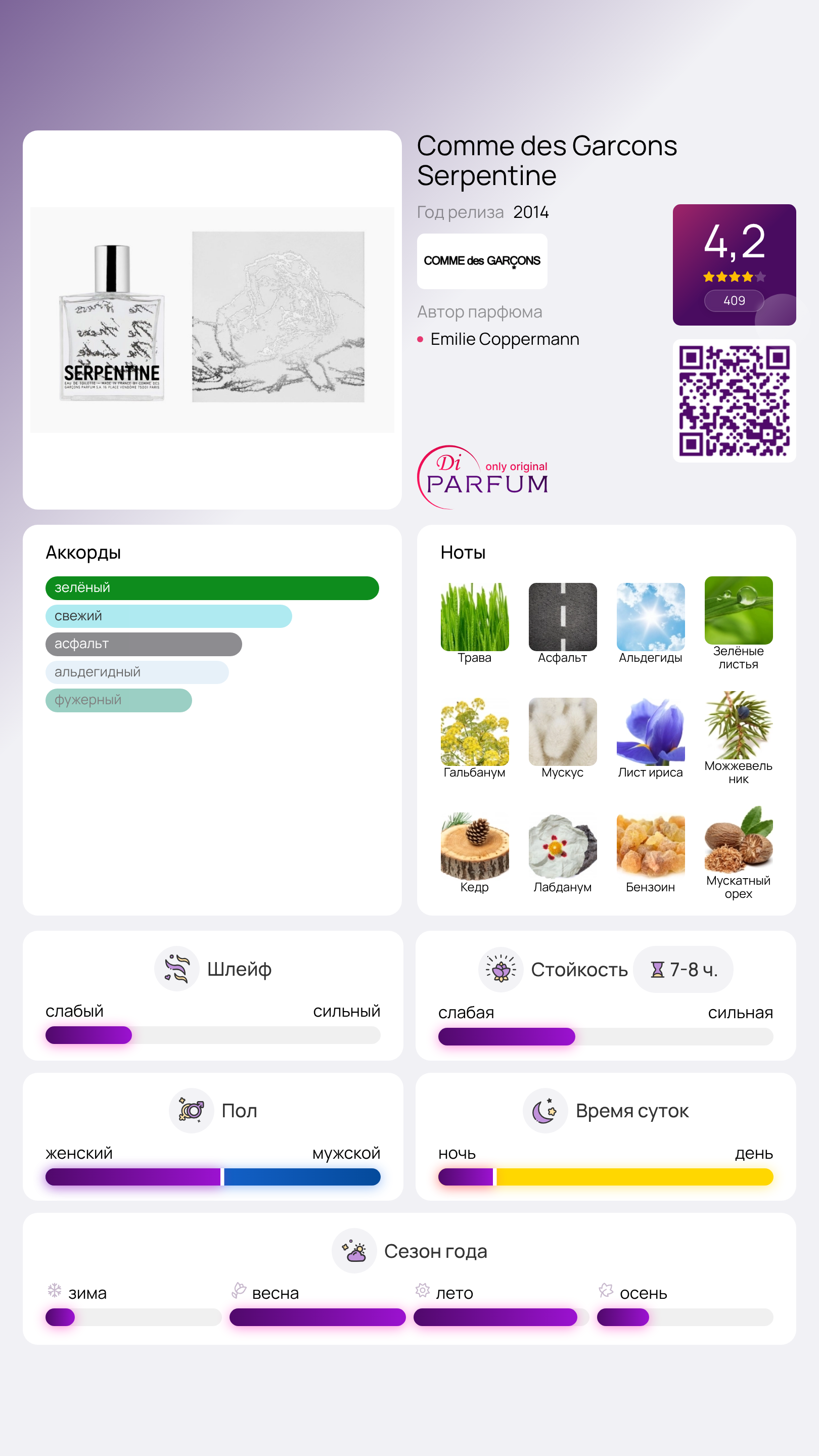 Путешествия по извилистым дорогам приносят захватывающее ощущение, а великолепие окружающих пейзажей просто не оставляет равнодушным. Парфюм Serpentine, который был представлен брендом Comme des Garcons и парфюмером Эмили (Bevierre) Куперманн в 2014 году, предлагает незабываемое приключение по крутящимся склонам и подъемам.