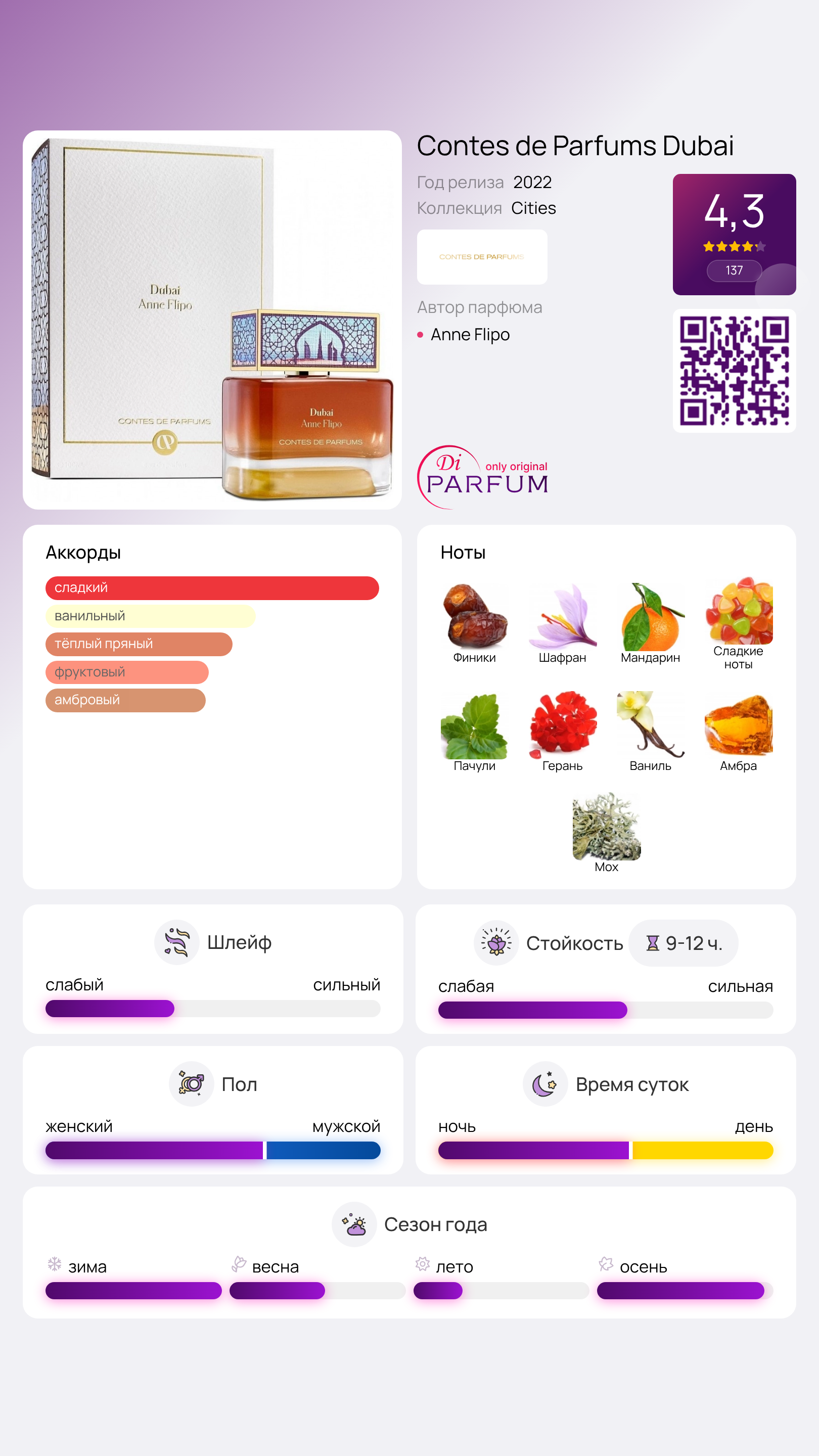 Contes de Parfums Dubai – это оригинальный, теплый и гармонично сладкий аромат, вдохновленный великолепием Дубая. Его пряные, восточные, цветочные и фруктовые ноты создают атмосферу неповторимой утонченности и элегантности, перед которой невозможно устоять.