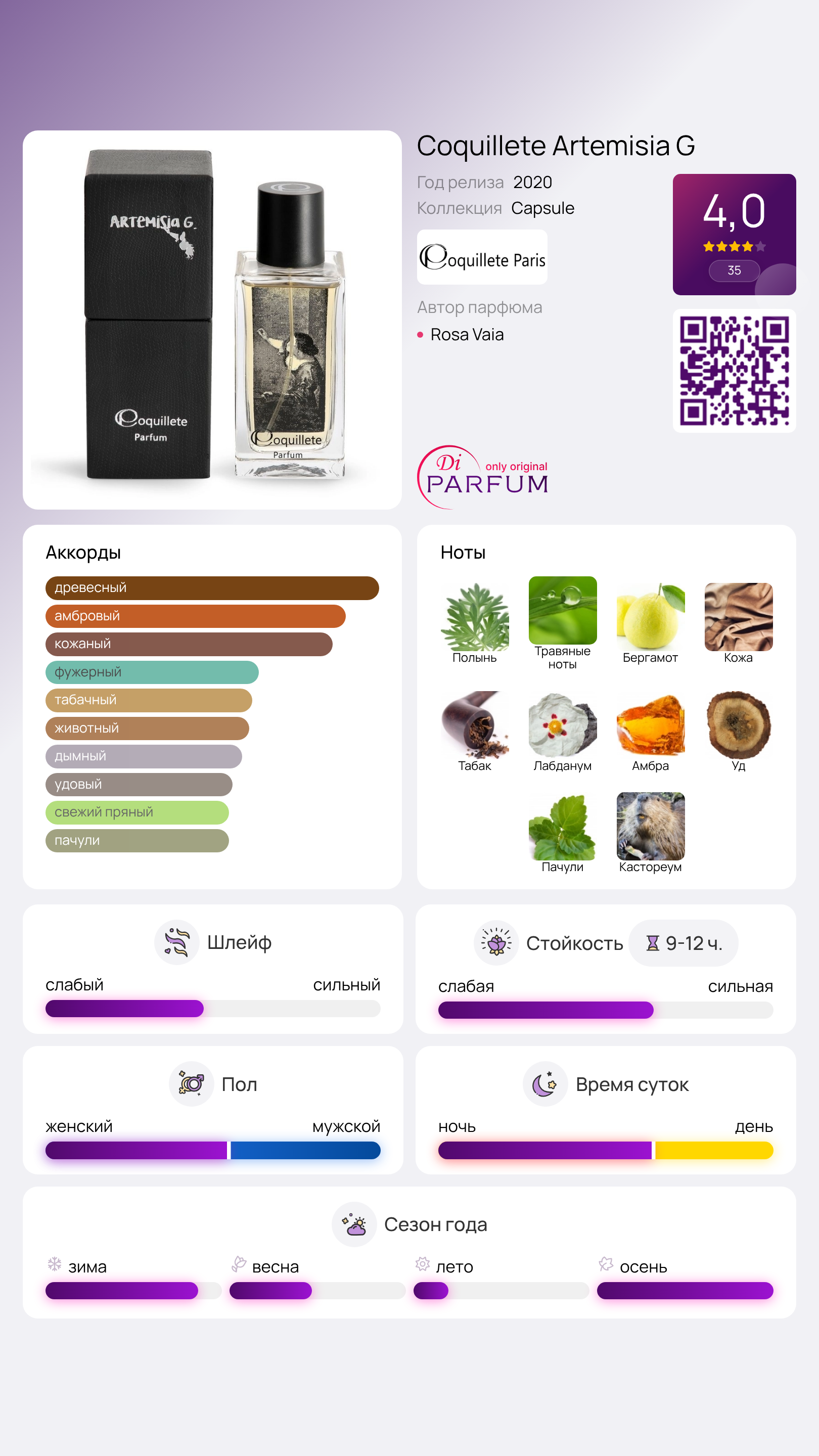 Сдержанная горечь, легкая терпкость и природная чистота полыни раскрываются в начале, гармонично сочетаясь с дикими травами и свежестью бергамота. В сердце аромата проявляются ноты кожи, табака и смолистого лабданума, создавая атмосферу старинной художественной мастерской. В базе аромата вновь звучат полынь и табачные акценты, окруженные лесным дымком ветивера, древесными нотами кедра, гваяка, пачули, а также насыщенными сексуальными оттенками кастореума, уда и амбры. Все эти организованные природные ноты придают аромату Coquillete Artemisia G великолепный шлейф.