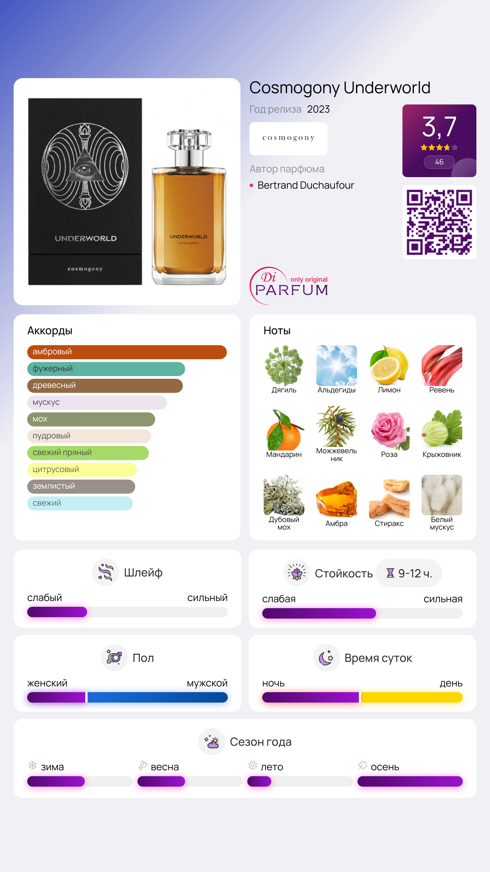 В обволакивающем шлейфе смолистый стиракс сливается с древесной мягкостью сливочного сандала. Мерцающая восточная амбра объединяется с нежным, шелковым белым мускусом. В качестве фона выступает влажная нега дубового мха. Эта теплая композиция Underworld от Cosmogony была выпущена российским брендом Brocard Group в 2023 году и входит в коллекцию для мужчин. Дизайн флакона, выполненный в строгом стиле, напоминает о драгоценном камне.