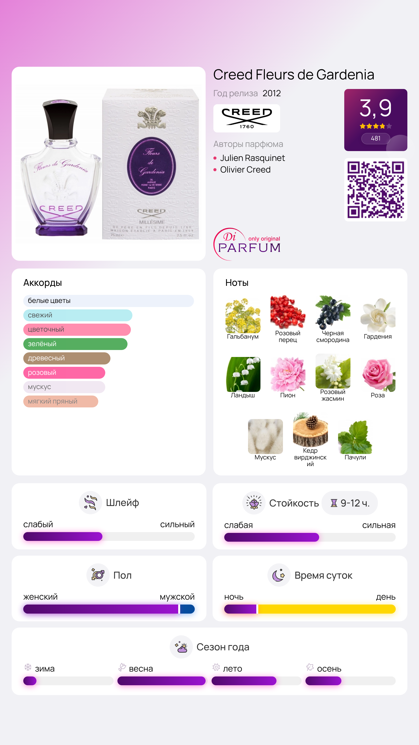 Аромат Fleurs de Gardenia от Creed представляет собой легок и полон романтики, рассказывая историю первой любви юной аристократки, которая в своей наивности и пылкости охвачена эмоциями. Начальные ноты композиции наполнены обаянием розового перца, гальбанума и свежей черной смородины.