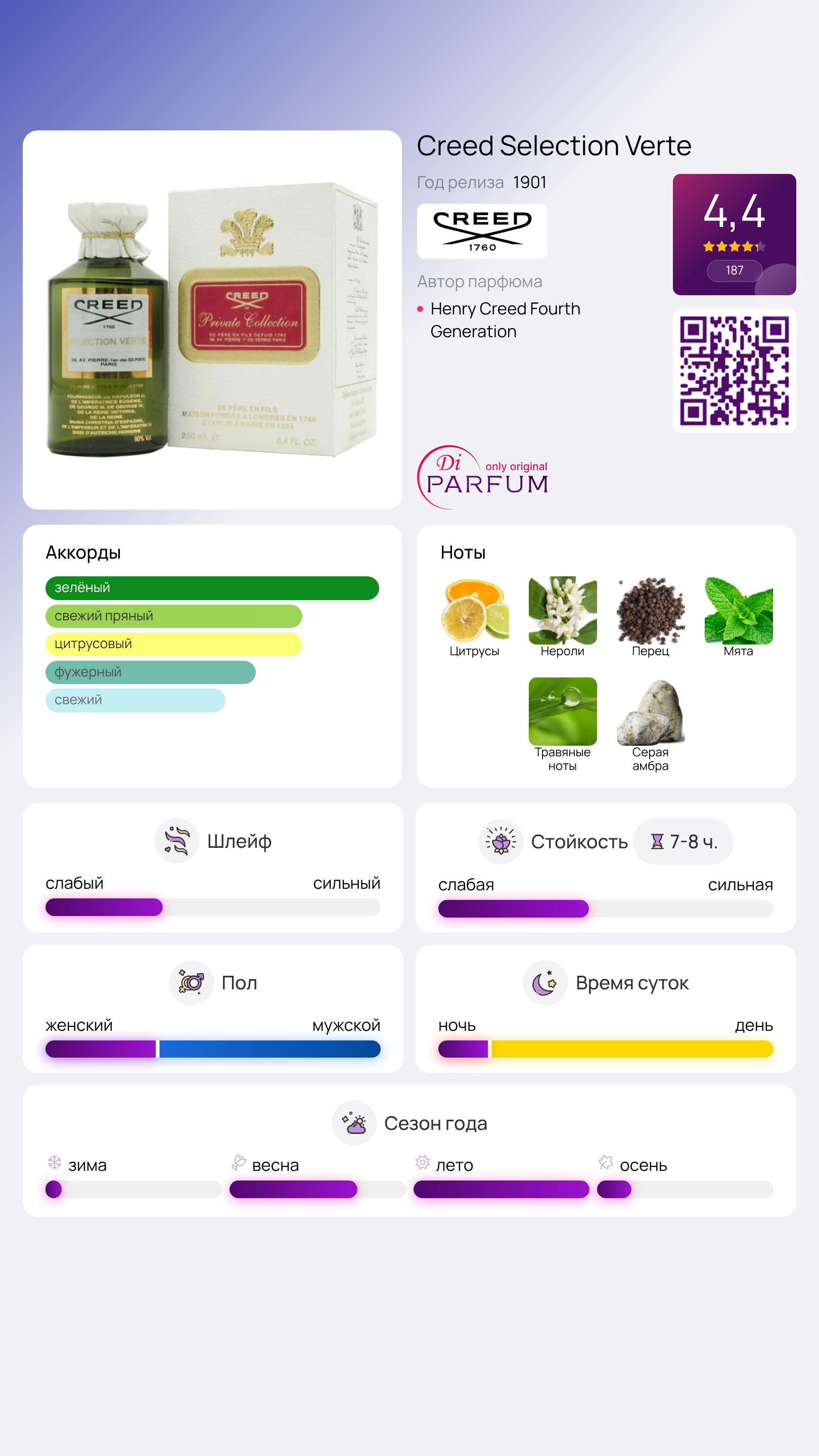 Selection Verte от Creed – это изысканная симфония природной гармонии, сотканная из любви и мира. Этот аромат вдохновляет обладателя, будь то мужчина или женщина, придавая надежду и жизненную силу. Он помогает поднять настроение в моменты подавленности. Утонченная и натуральная парфюмерная вода идеально подходит для повседневного использования, особенно раскрывая свою красоту в теплоте летних дней.