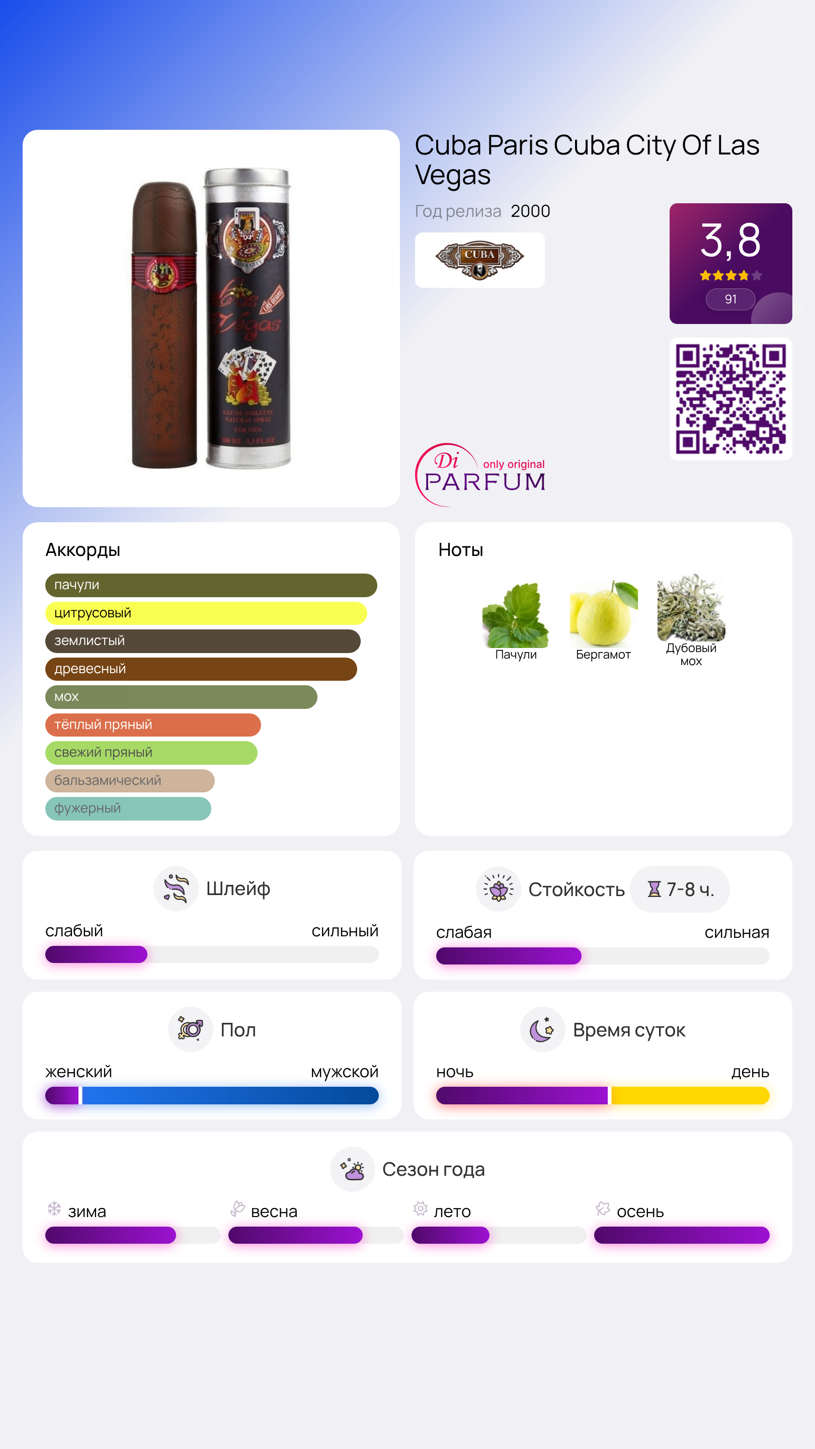 Шикарный шипровый аромат Cuba Paris Cuba City Of Las Vegas представляет собой стильный и молодежный выбор для дневного использования. У него есть девиз: «Лас-Вегас никогда не спит!». Этот парфюм переносит вас в атмосферу свирепого веселья и азарта, позволяя ощутить дерзость и мощный заряд оптимизма.