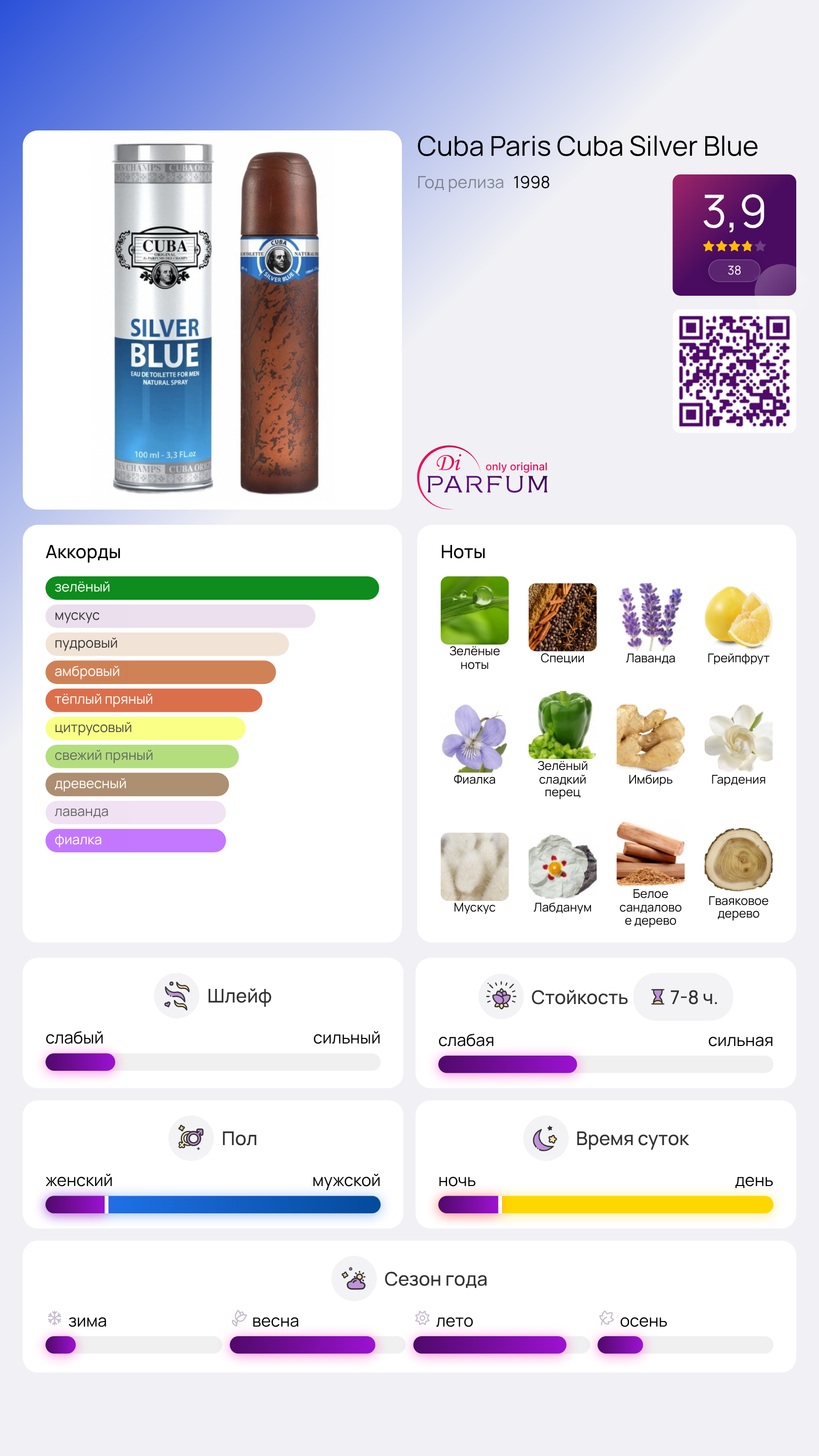 Cuba Silver Blue от Cuba Paris – это восторг для мужчин, которые ценят уникальные ароматы. Этот парфюм дополнит ваш образ, придавая ему свежесть и элегантность. Верхние ноты питают аромат яркими зелеными акцентами, специями, лавандой, грейпфрутом, бергамотом и петитгрейном, создавая незабываемое первое впечатление.