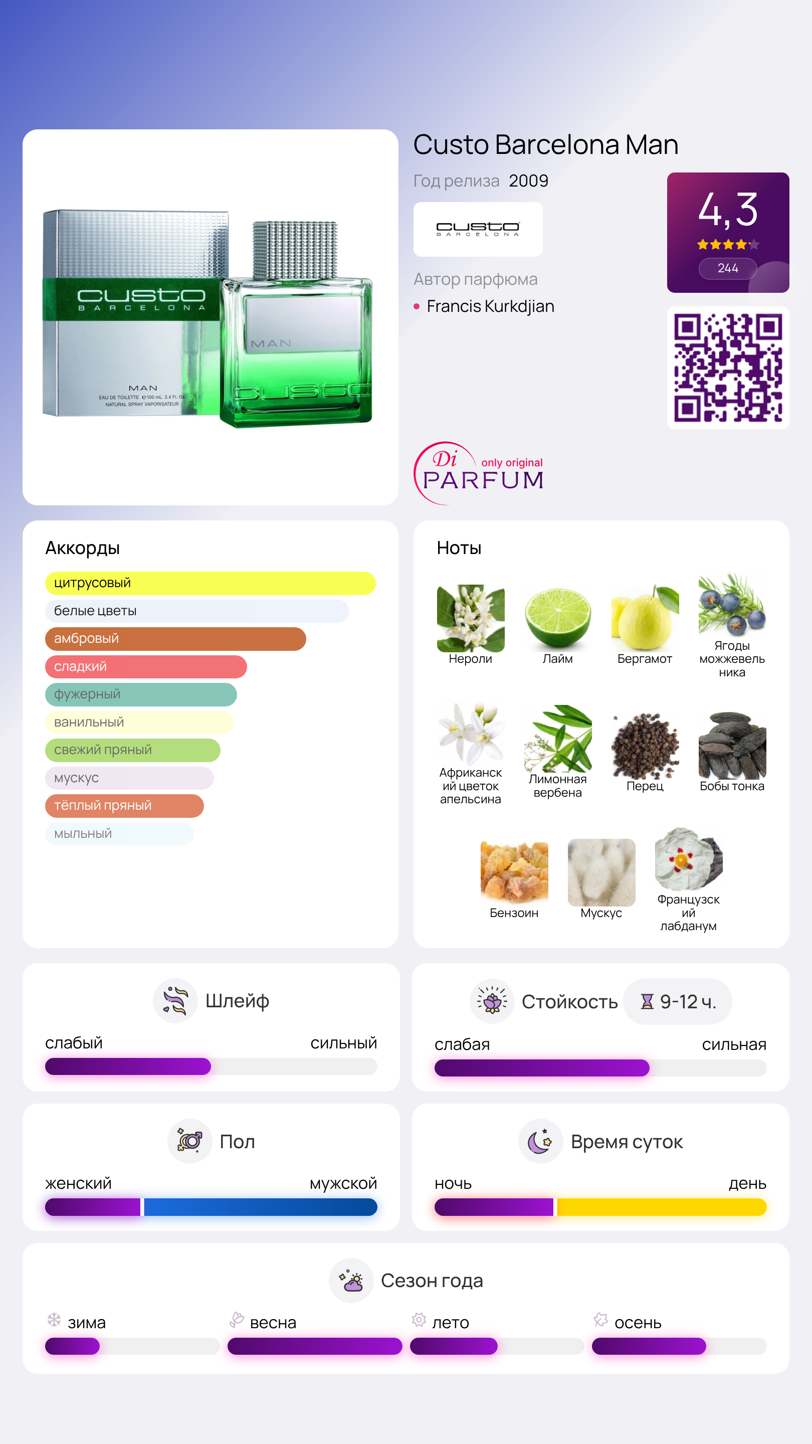 Независимо от того, кто он — смелый искатель приключений, общительный новичок или увлеченный спортсмен, владелец Custo Man — это активный человек! Состав аромата включает: средиземноморский лайм, бергамот, нероли, можжевеловые ягоды, цветы апельсина, лимон, вербену, черный перец, бензойную смолу, бобы тонка, лабданум и мускус.