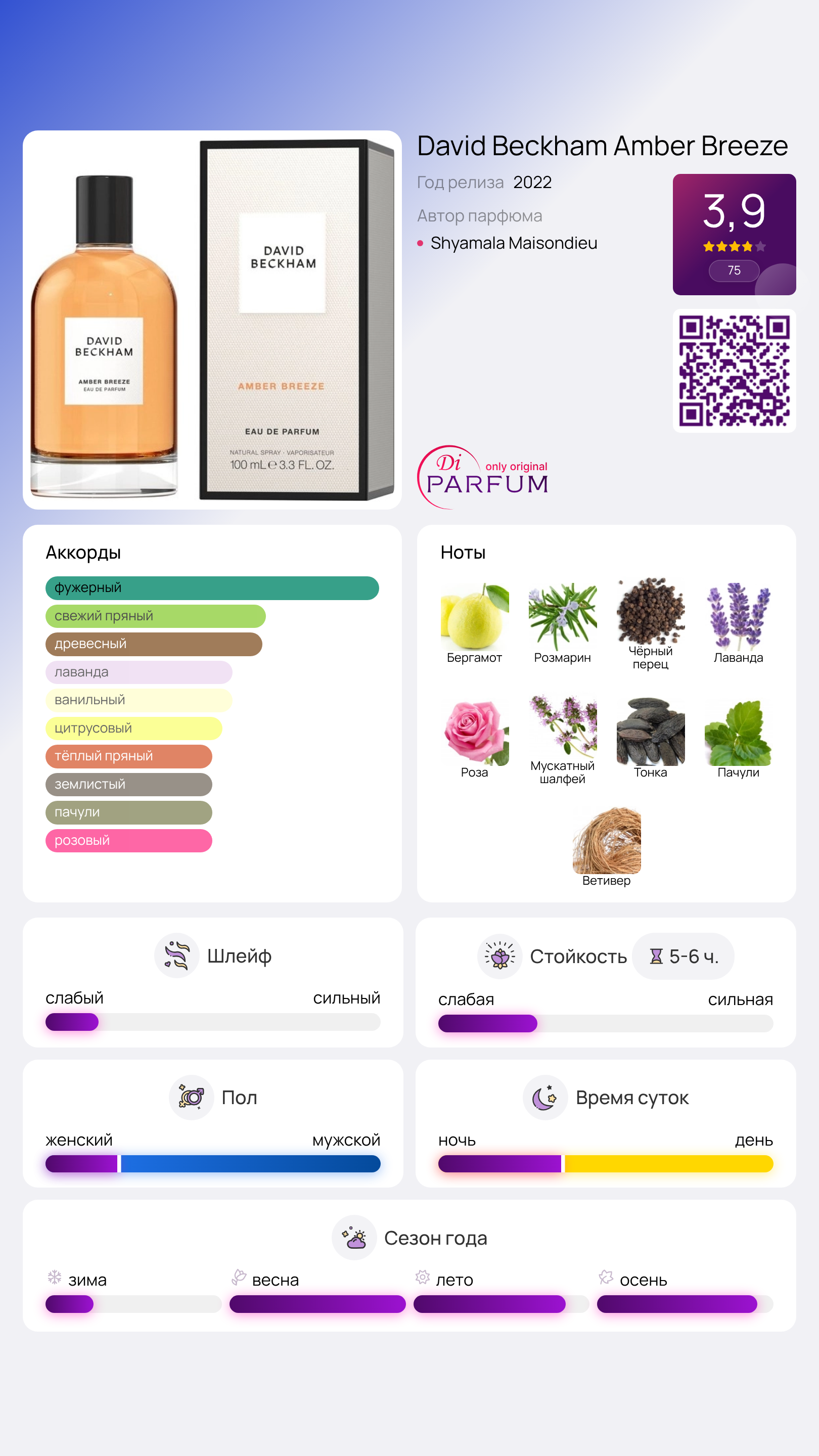 Amber Breeze от David Beckham - это древесно-ароматическая парфюмерная композиция для мужчин, выпущенная в 2022 году. За создание этого аромата отвечает парфюмер Shyamala Maisondieu. Верхние ноты аромата включают бергамот, розмарин и черный перец, в сердце - лаванда, роза и мускатный шалфей, а глубокие нотки составляют бобы тонка, пачули и ветивер.