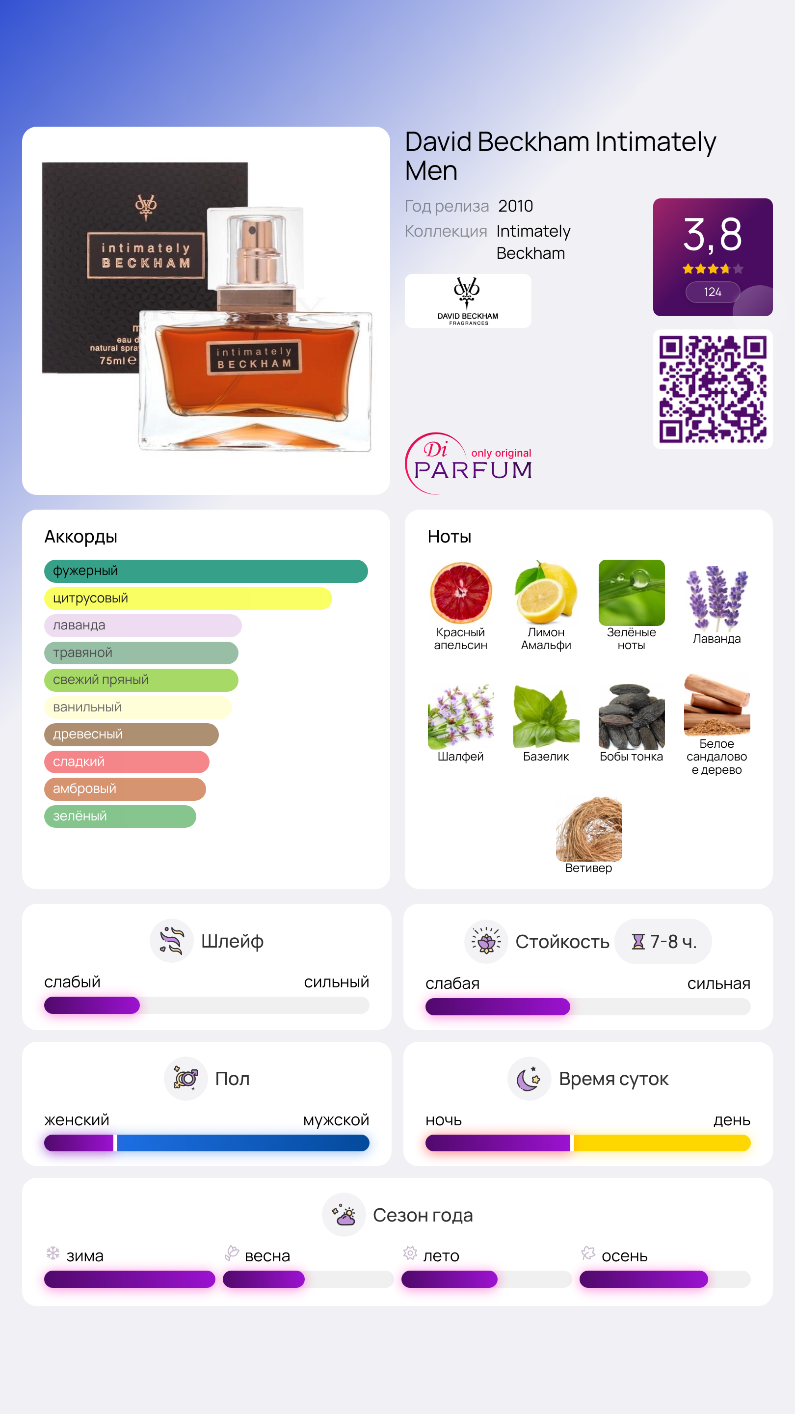 Аромат Intimately Men от David Beckham олицетворяет уверенность в мужественности и яркость таланта. Этот парфюм раскрывает сексуальную и чувственную природу Дэвида. Современная древесно-пряная композиция приносит тепло и нежность.