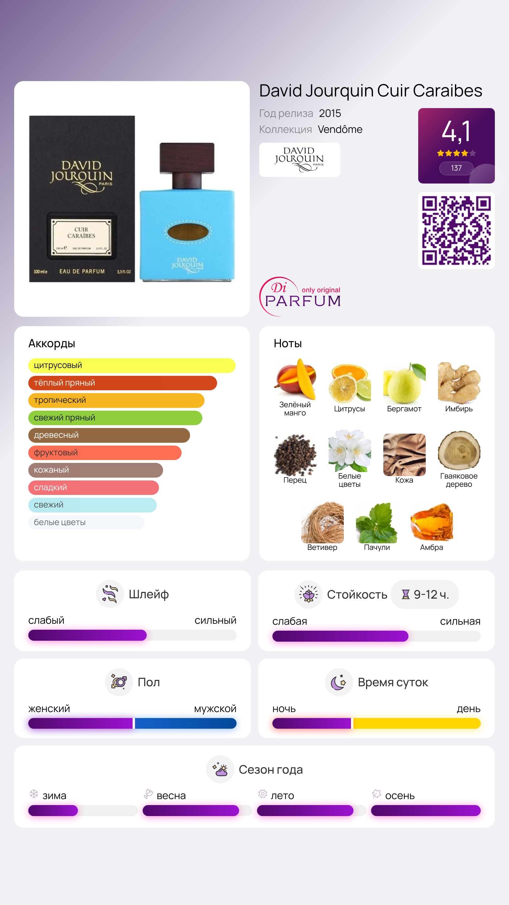 Парфюм Cuir Caraibes от David Jourquin представляет собой освежающий пряно-древесный эликсир, вдохновленный детскими воспоминаниями создателя о праздничных днях в Гваделупе. Основное внимание уделено тропическому аромату кожи и путешествию. Это запах летом на океанском побережье, где воздух наполнен фруктовыми нотами, ромом и морским бризом, а вечера проходят в танцах у костра.
