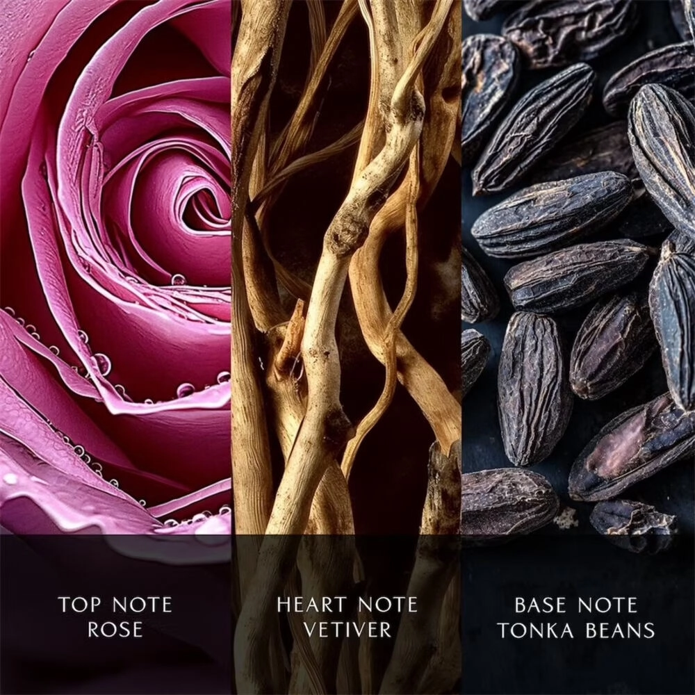 Начальные ноты раскрываются с великолепной розой, наполняющей пространство своим нежным и утончённым ароматом. В сердце пирамидки свежие цветочные акценты плавно переходят к насыщенному древесно-землистому ветиверу, который добавляет звучанию глубину и характер. Завершают композицию сладкие бобы тонка в базе, которые привносят тепло и мягкость, создавая уютный и обволакивающий шлейф.