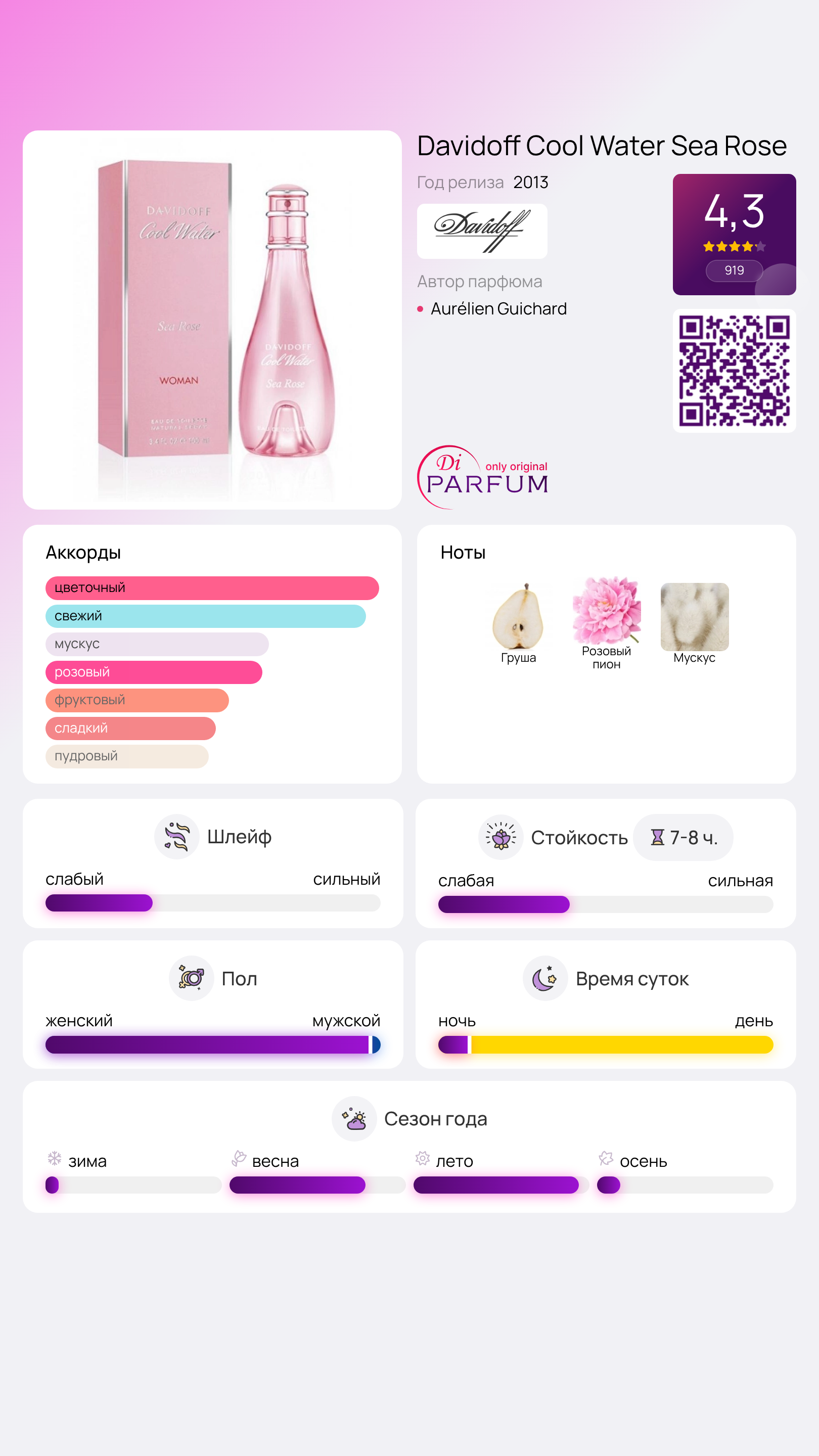 Cool Water Sea Rose идеально подходит для современных женщин, которые ценят утонченность и легкость. Этот аромат подарит вам ощущения летнего утра, свежести и радости.»
