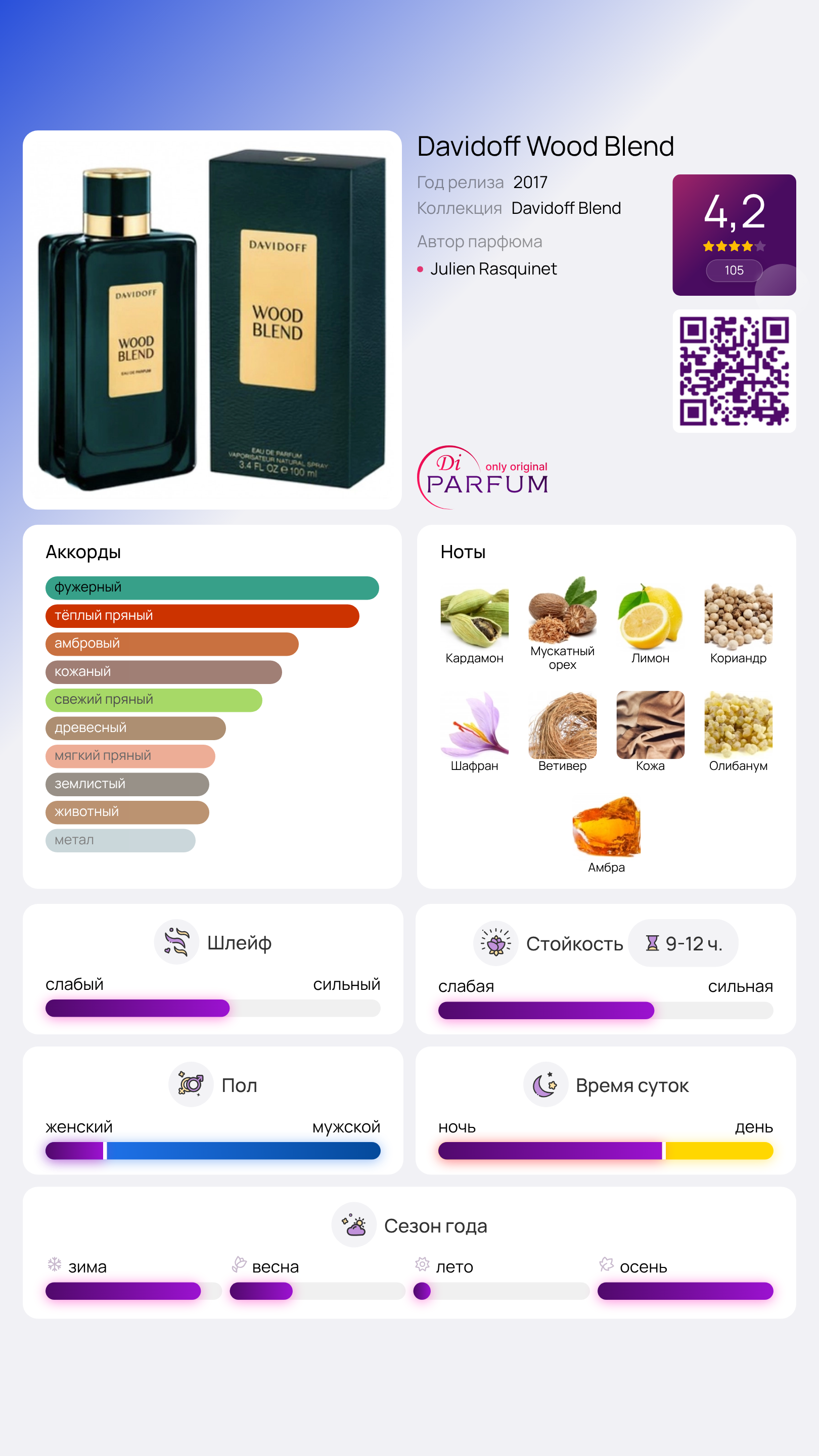 Сердце аромата наполнено гармонией кориандра, шафрана и ветивера, что придает ему элегантную глубину и изысканность. В базе вы чувствуете тёплые ноты кожи, олибанума и амбры, которые придают аромату стойкость и выразительность. Wood Blend — это не просто парфюм, а целое путешествие в мир ощущений и эмоций.