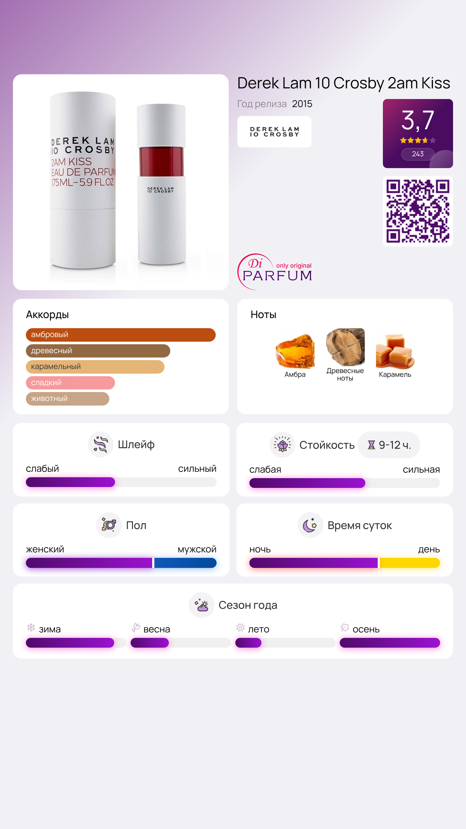 Derek Lam 10 Crosby 2am Kiss – один из ароматов этой серии, обладающий ярким восточным оттенком. Он символизирует страстный поцелуй и переживания, которые с ним связаны. В его нотах чувствуются сильные эмоции, а сердце будто готово вырваться из груди – атмосфера накалена до предела. 2am Kiss звучит уверенно и настойчиво, но при этом остается благородным.