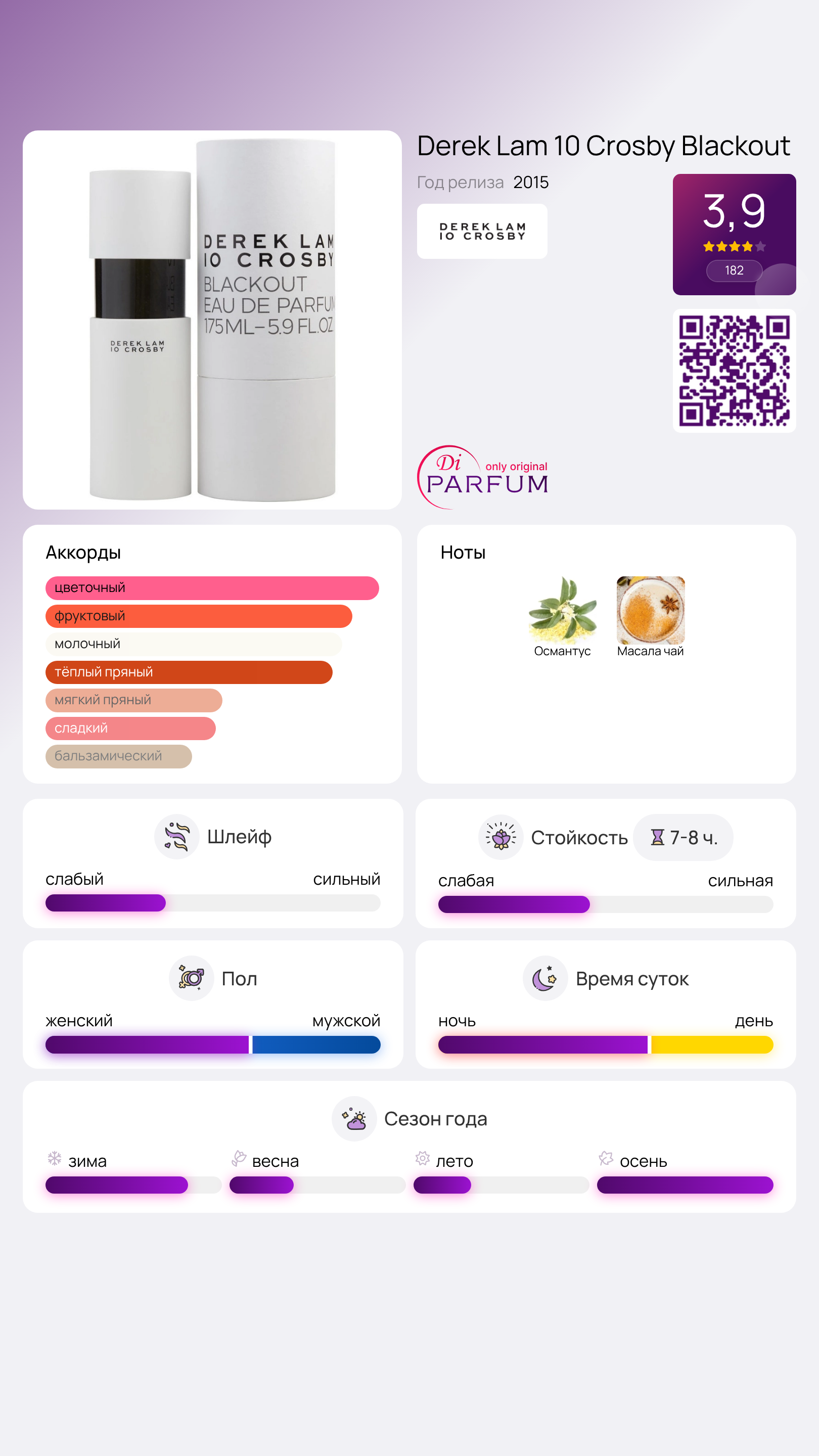 Композиция демонстрирует контраст между теплом и свежестью, а также чувственностью и нежностью. С одной стороны, сладкий османтус с медово-абрикосовыми нотами и бархатистой молочной текстурой добавляет насыщенности, а с другой стороны, освежающие аккорды чая масала с пряными травами уравновешивают аромат. Их ароматные тени создают теплый, приятный шлейф. Переливы в Derek Lam 10 Crosby Blackout придают ему восточный характер, насыщенный загадкой, чувственностью и теплотой.