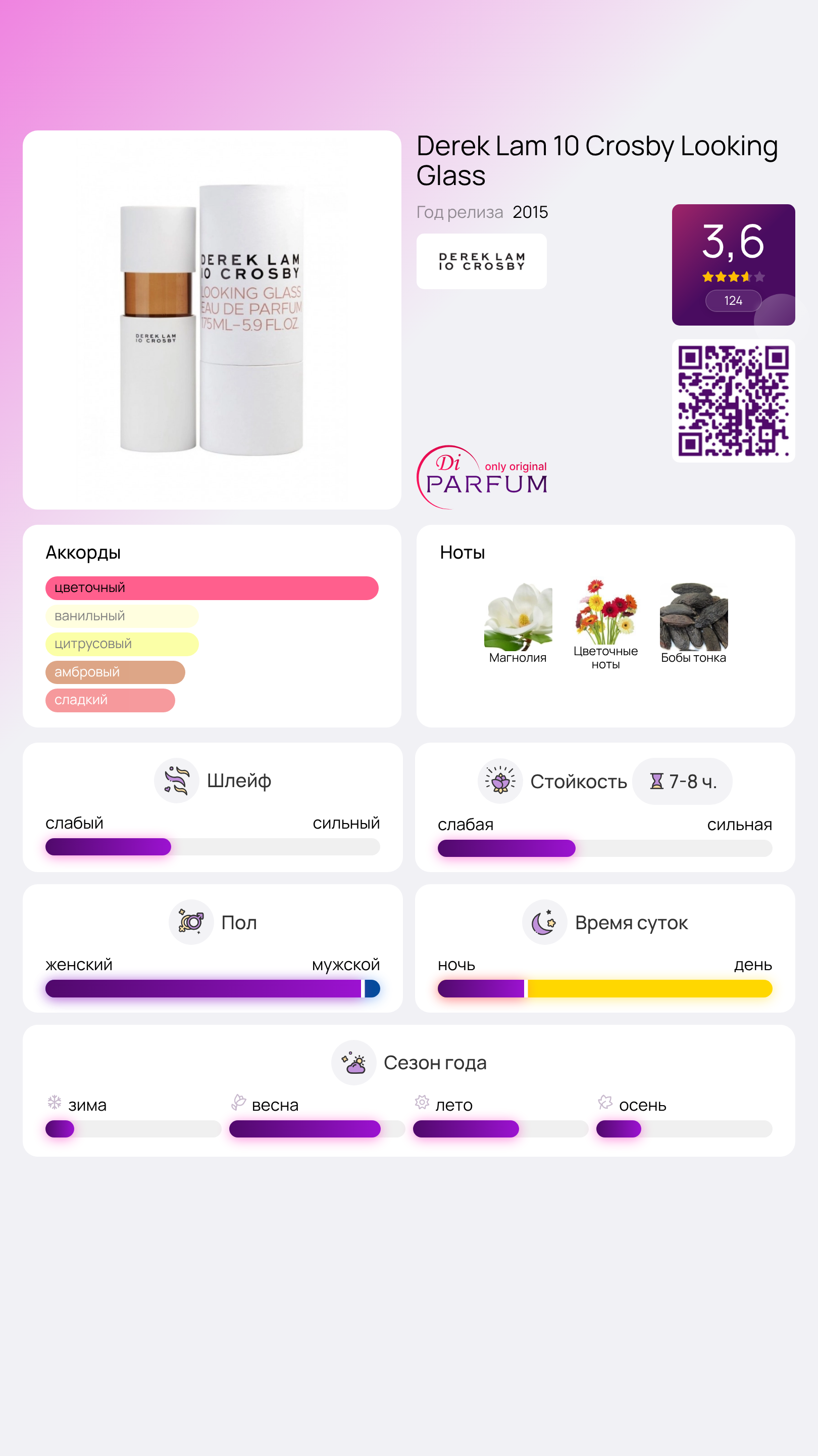 С переходом к сердцу аромата настроения меняются, открывая сдержанные бобы тонка с их еле заметной сладковато-дымной атмосферой. Завершают композицию цветочные акценты, которые добавляют легкости и женственности. Derek Lam 10 Crosby Looking Glass удивит вас своим ярким и в чем-то даже大胆ным звучанием, насыщенным женским очарованием.
